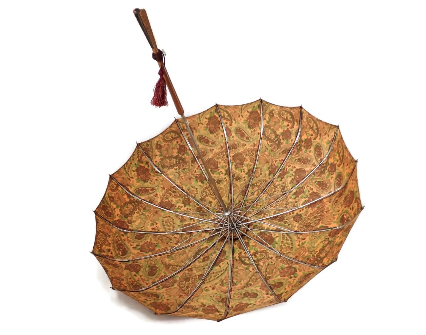 1950s Paisley Pagoda Umbrella w/Bamboo Horn Handle Tassel signed SH
