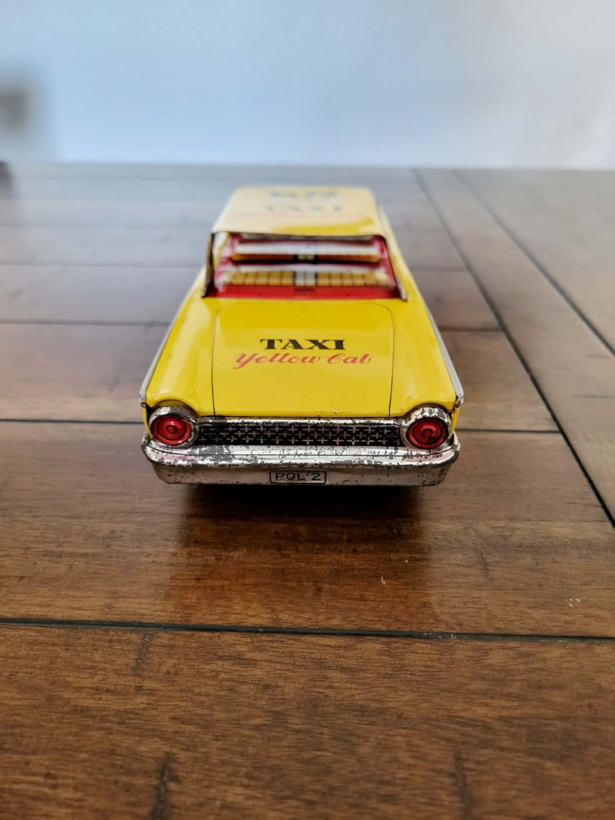 Vintage 1960s Taiyo Tin Friction Ford Taxi Yellow Cab 66 Toy Car Made In Japan