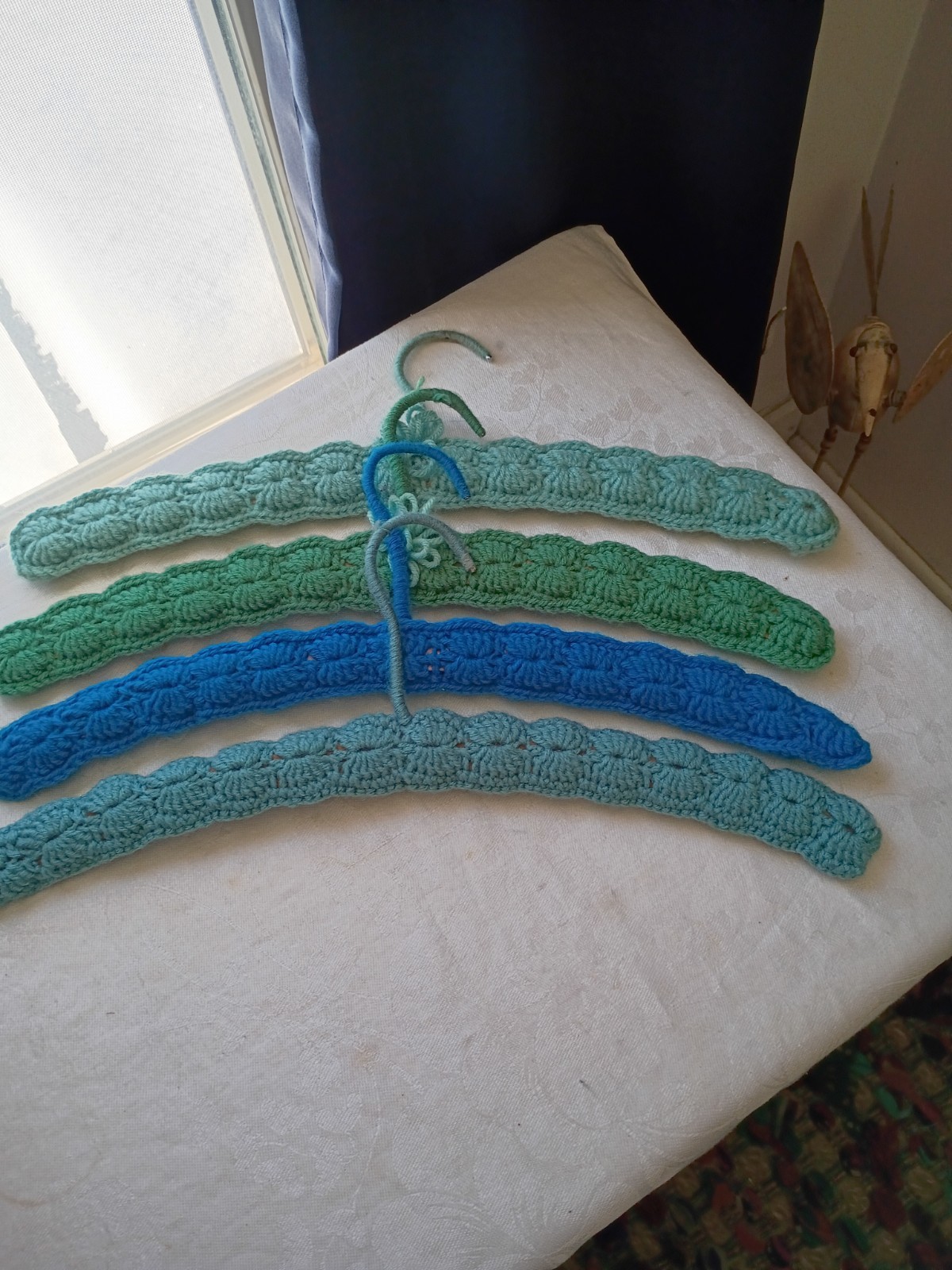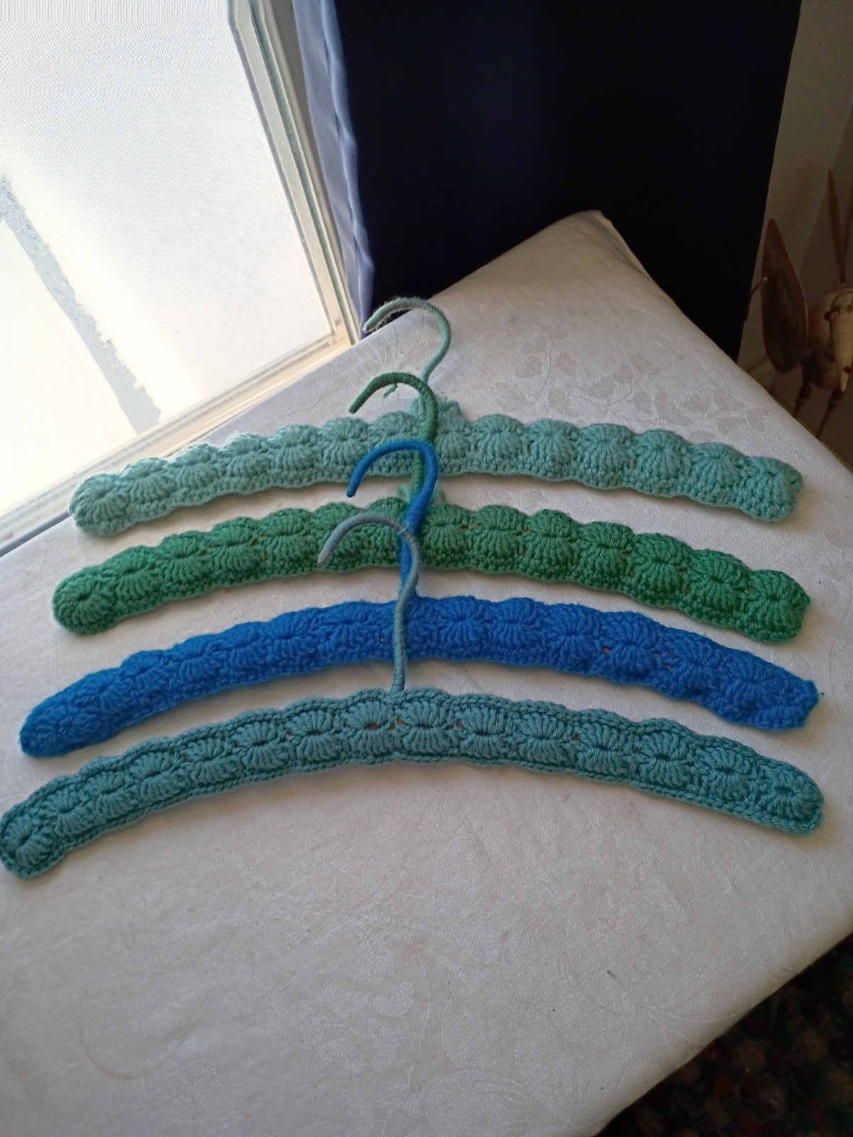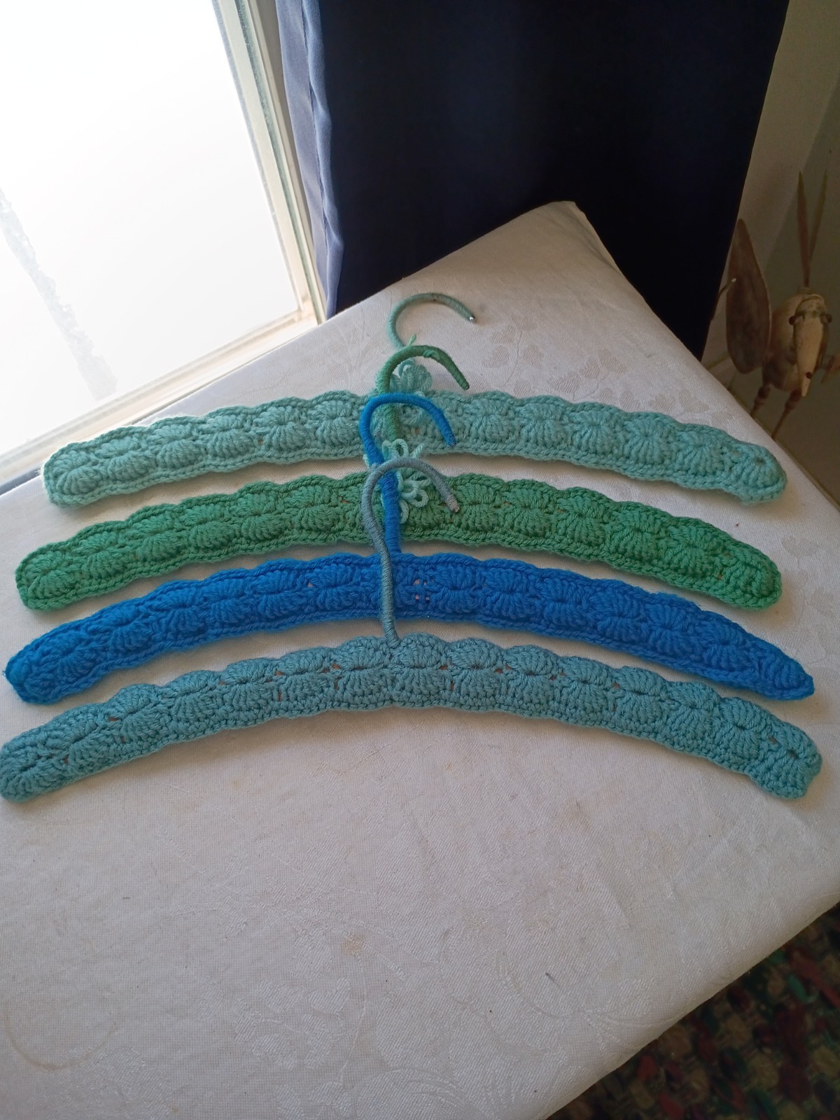 VTG 4 Handmade Crocheted Wooden Hangers-Sage Green Teal 17L Yarn Covered