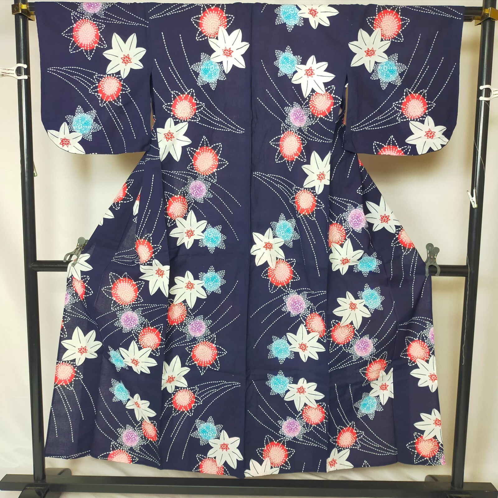 • Vintage kimono Yukata Robe Colorful flowers and autumn leaves pattern 9610
