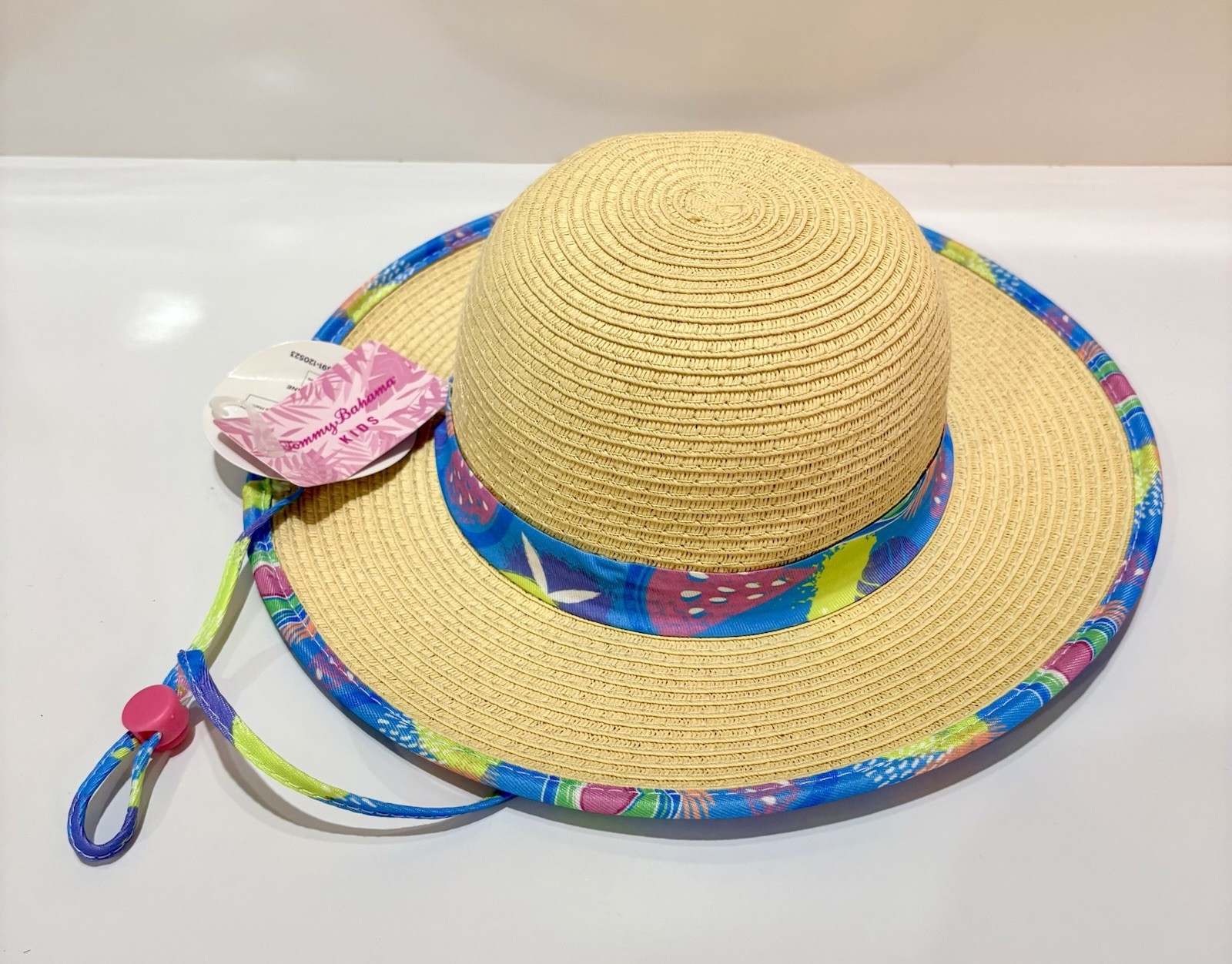 Tommy Bahama Girls Light Straw Hat for Sun Beach Colorful Trim, Chin Strap NWT