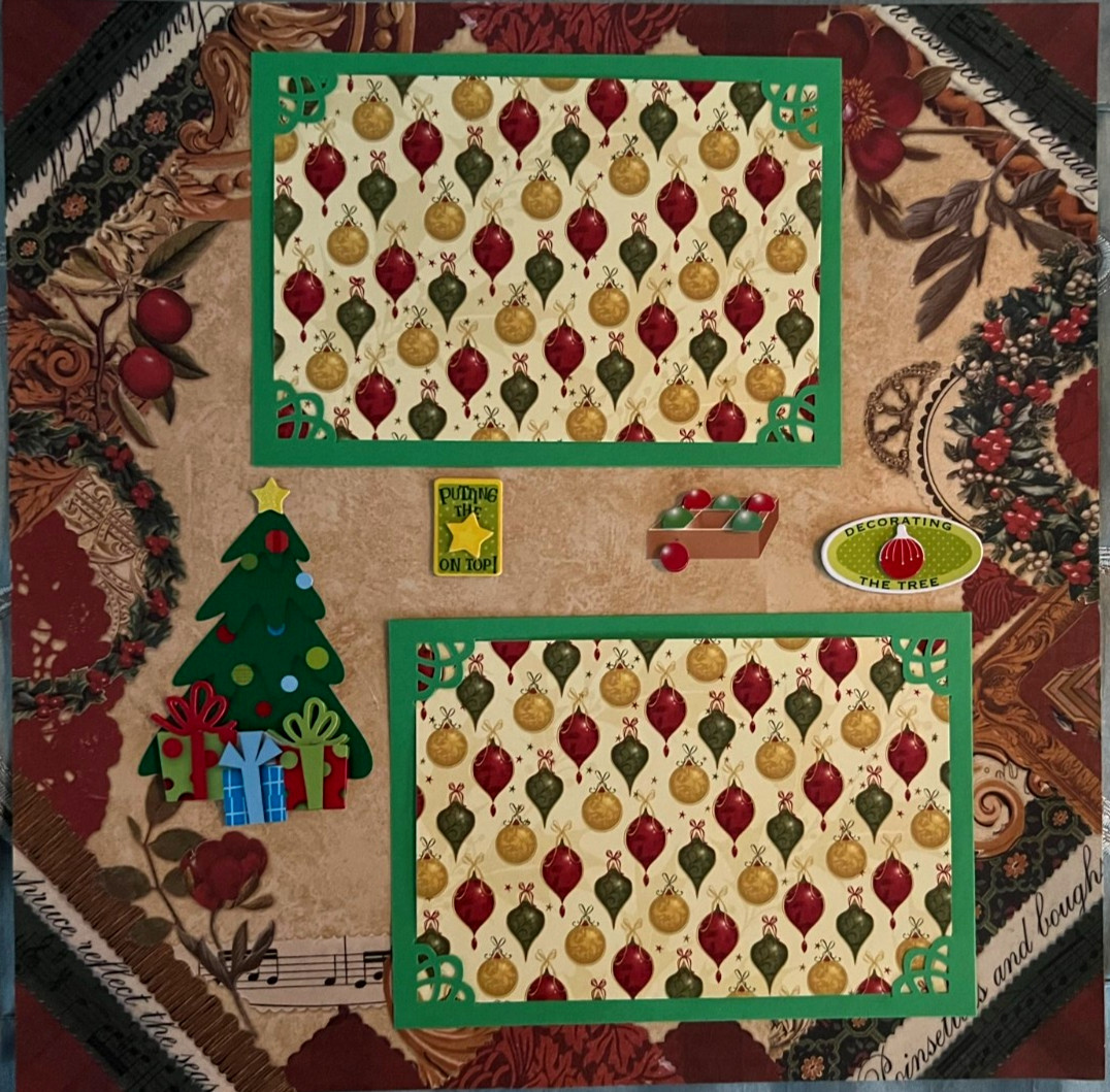 2 DECORATING THE CHRISTMAS TREE PREMADE SCRAPBOOK PAPER PAGES 3-D EMBELLISHMENTS