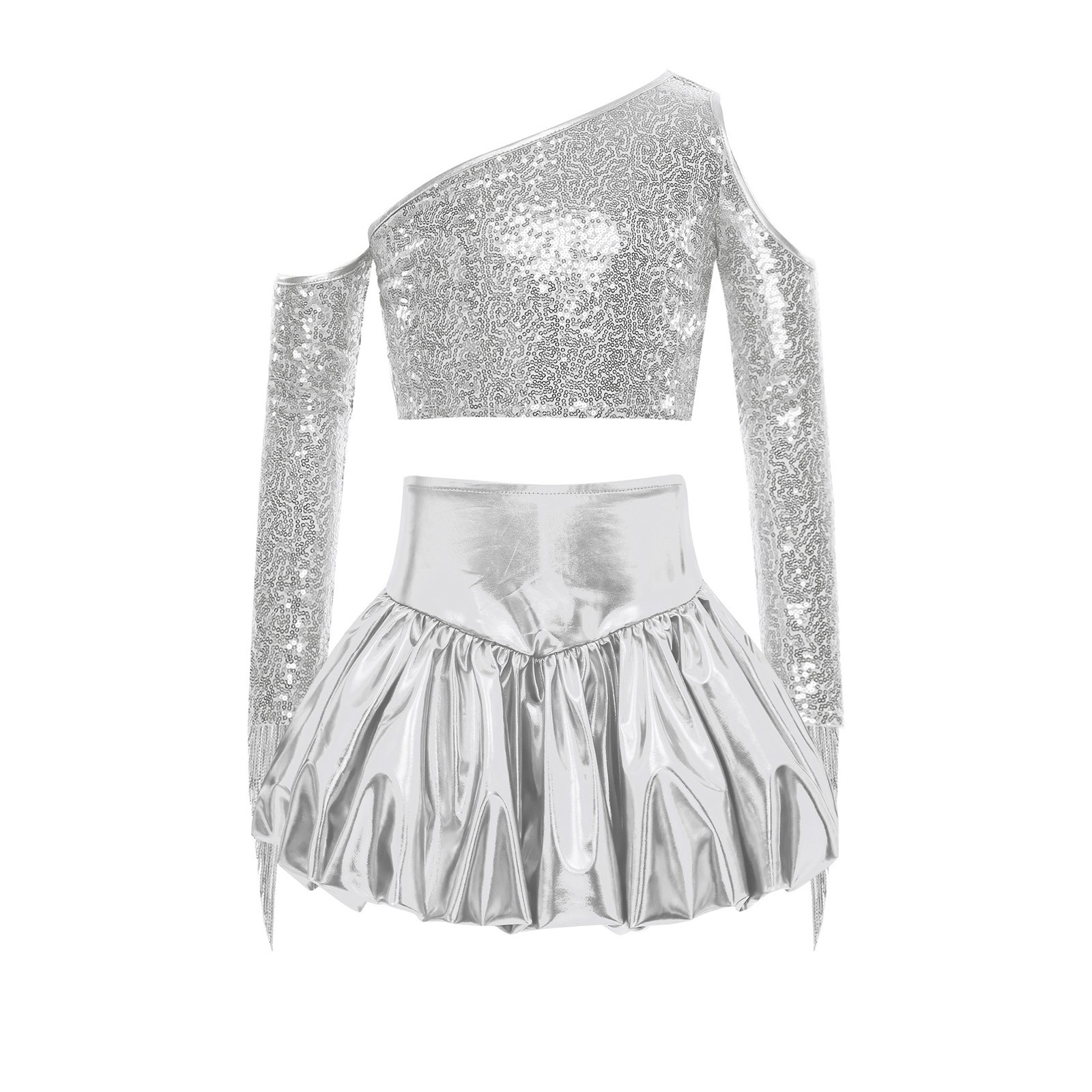 Kids Girls Metallic Shiny Stage Outfit Cold Shoulder Crop Top with Skirts Onival