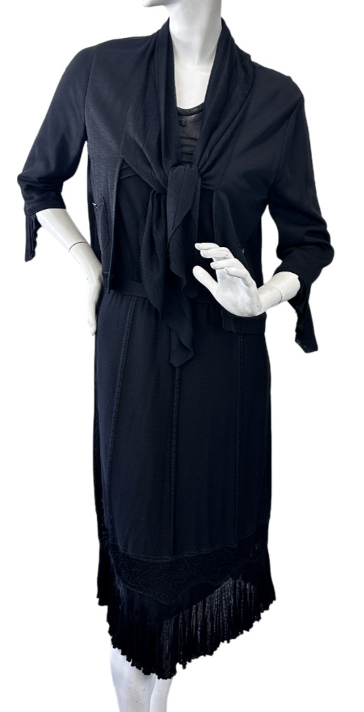 Vintage CHANEL Knit Dress 44 12 Black Lace Frill CC Logo Bow Tie 2006 Lining
