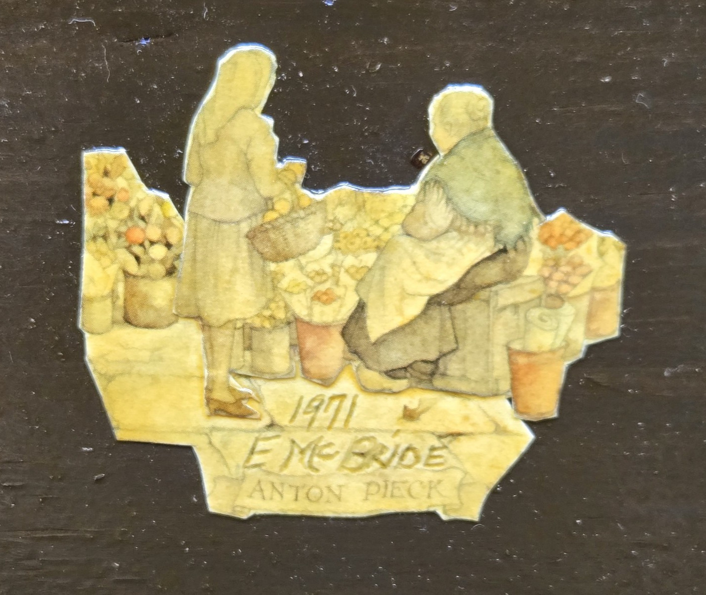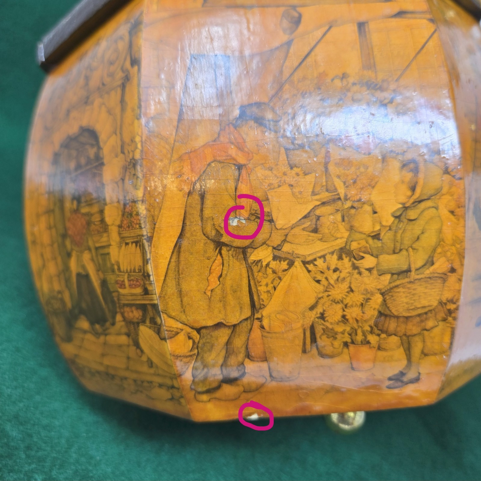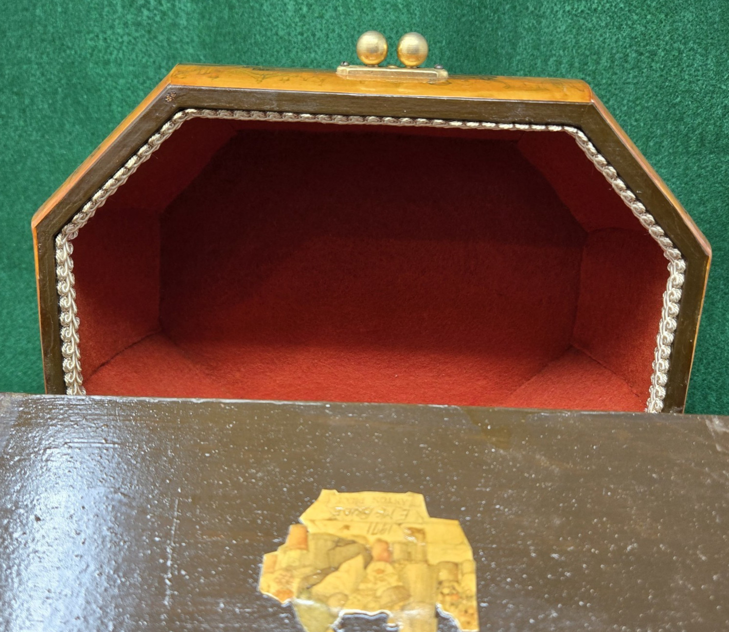 как выглядит Vtg Anton Pieck Octagon Purse w Lucite Handle MCM Wooden Decoupage Handbag фото