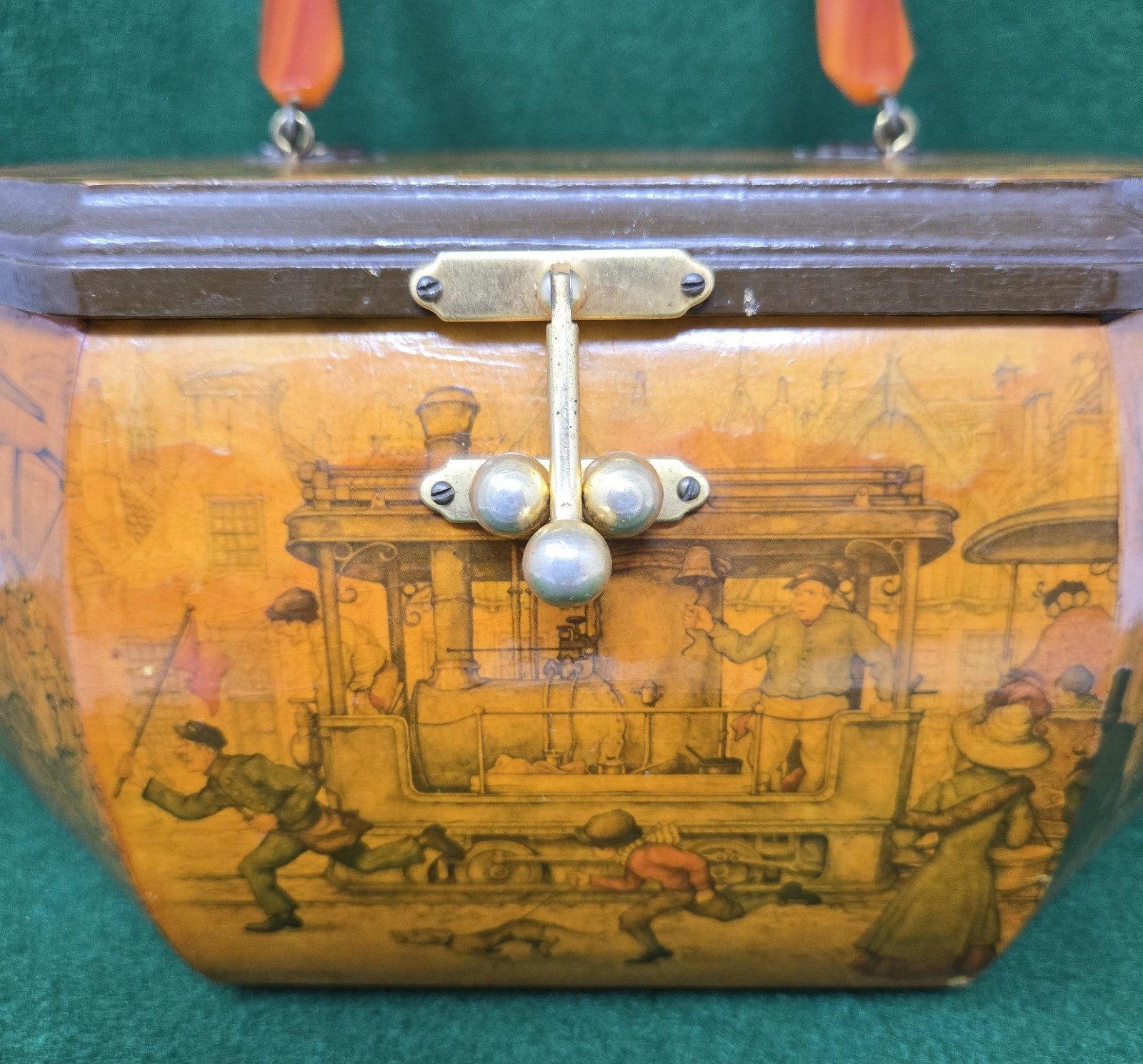 Vtg Anton Pieck Octagon Purse w Lucite Handle MCM Wooden Decoupage Handbag