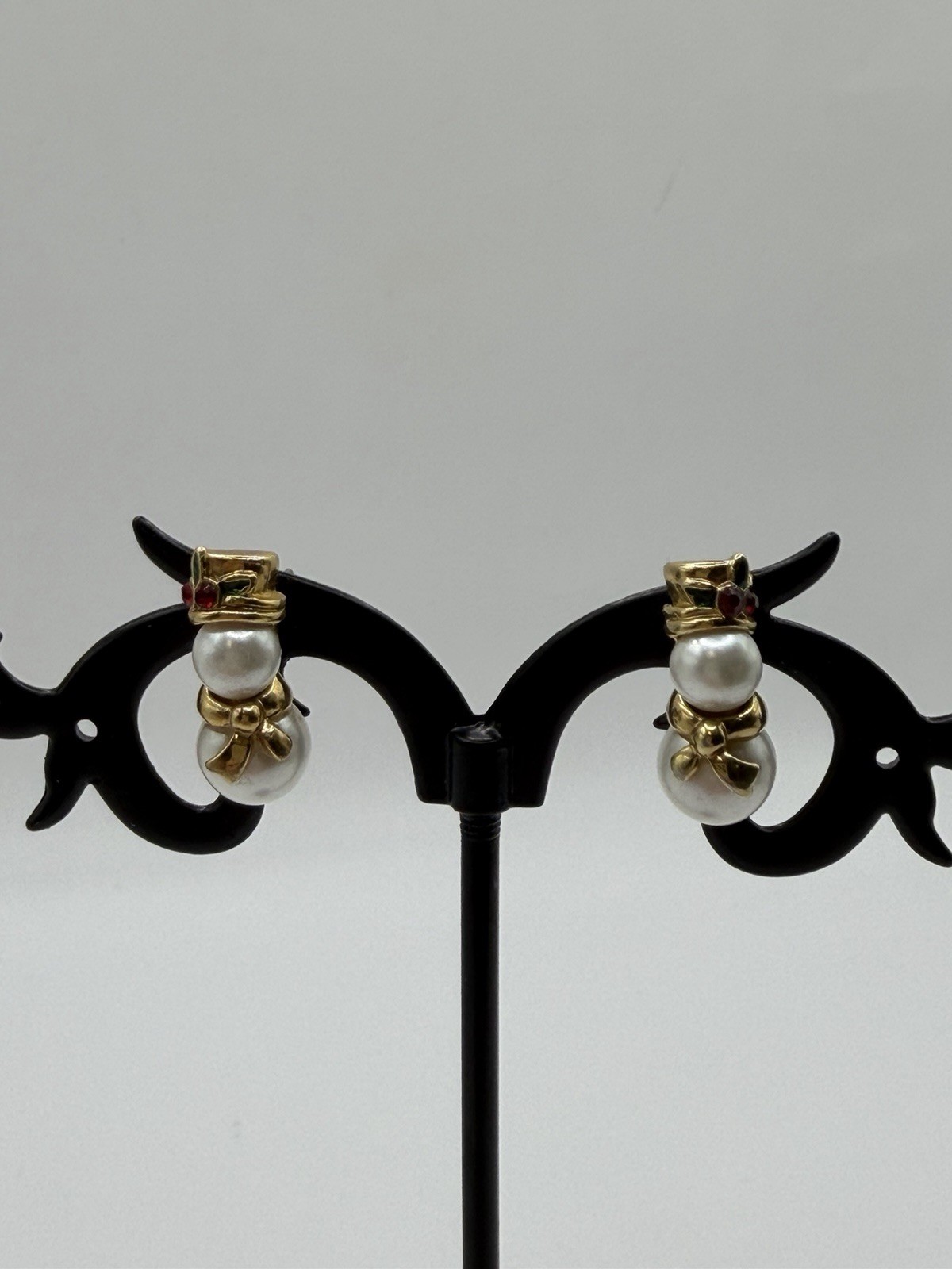 как выглядит Avon Faux Pearl Snowman Rhinestone Holly Pierced Post Stud Earrings фото