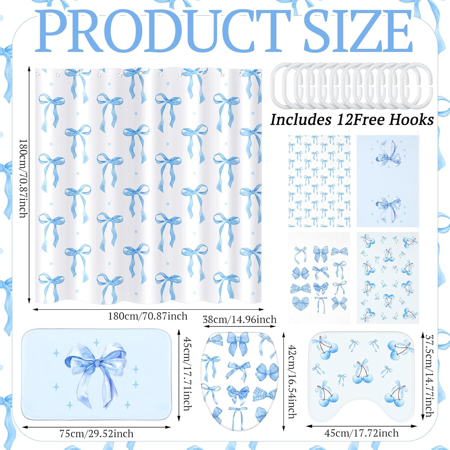Included Components: 1 x Blue bow Shower curtain ,1 x Blue bow Bath mat,1 x Blue U sha