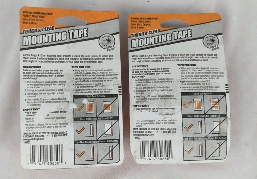 Lot Of 2 Gorilla Mounting Tape Double Sided Adhesive Roll, Strong Hold 1 in x 60