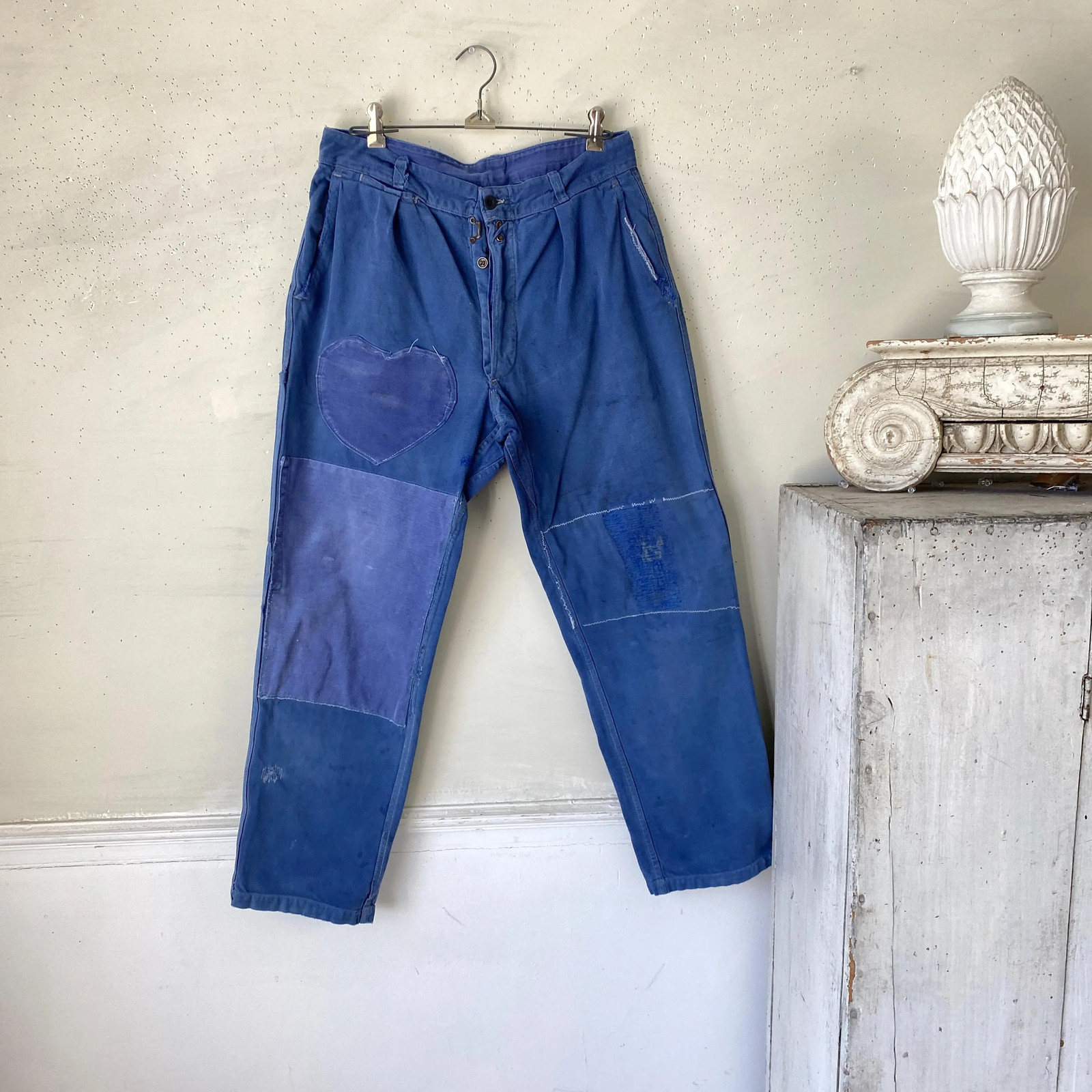 • 32 waist Vintage French Indigo Work Pants 1940 s 1950 s 1960 s Patched Bleu de
