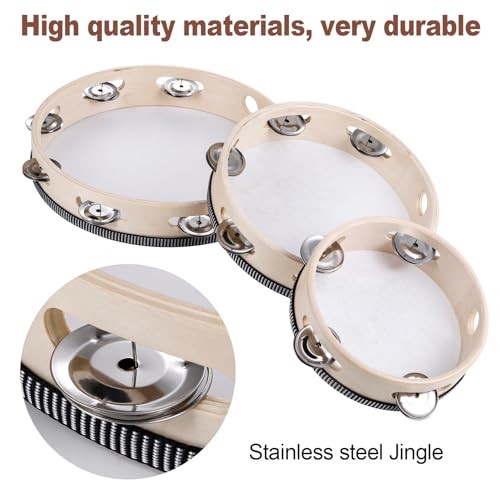 3 Pack Tambourine for Adults Hand Held Wood Single Row 4 Inch 6 Inch 8 Inch