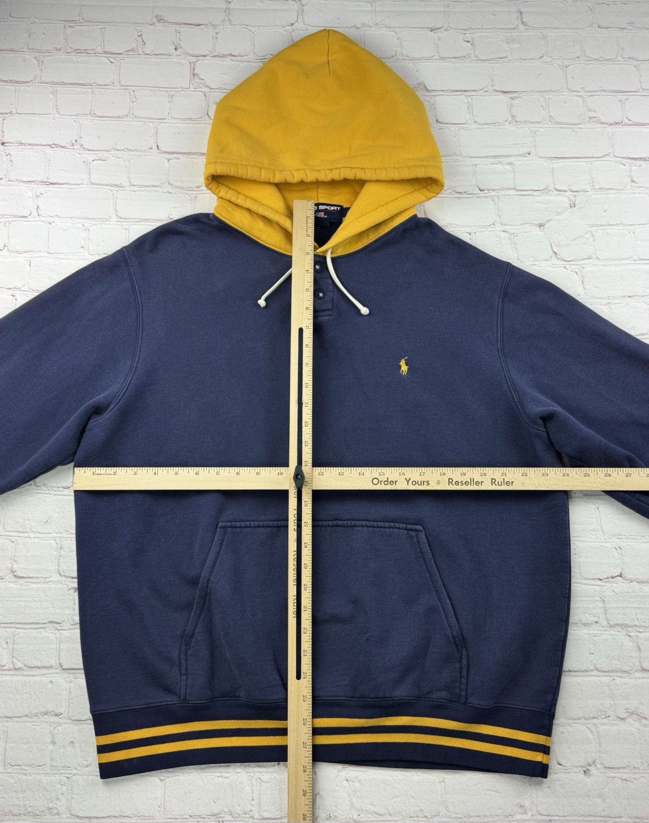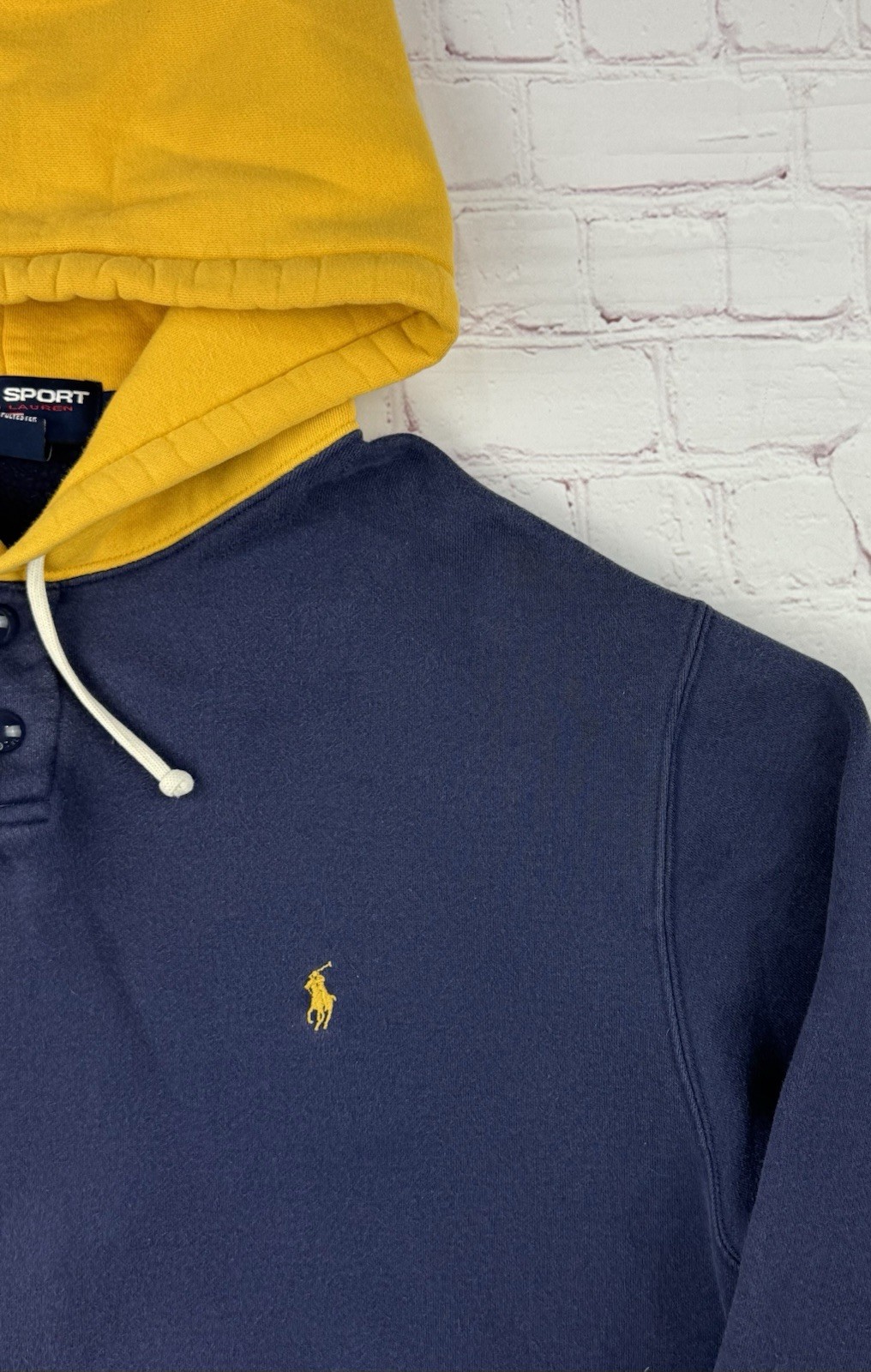 как выглядит Vintage 90s Polo Sport Ralph Lauren Navy Blue Yellow Hoodie Fleece Lined LG USA фото