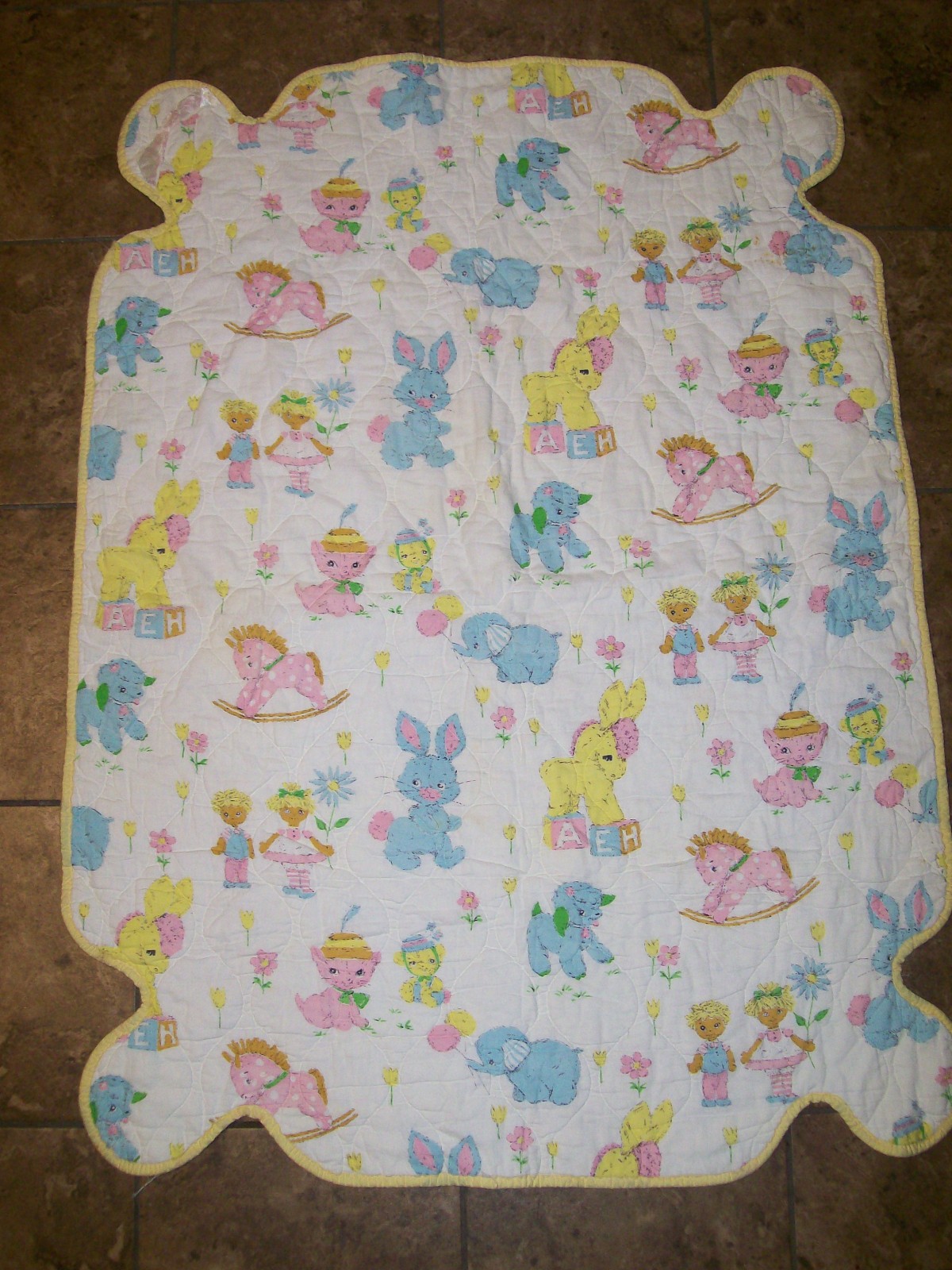 Vintage Baby Blanket Crib Quilt Pastel Lamb Elephant Boy GIrl Bunny 42x32