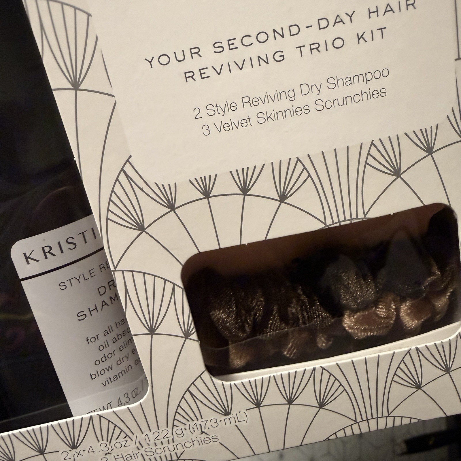 как выглядит NIB Kristin Ess Hair Style Reviving Dry shampoo set Of 2 4.3 Oz 3 Scrunchies Box фото