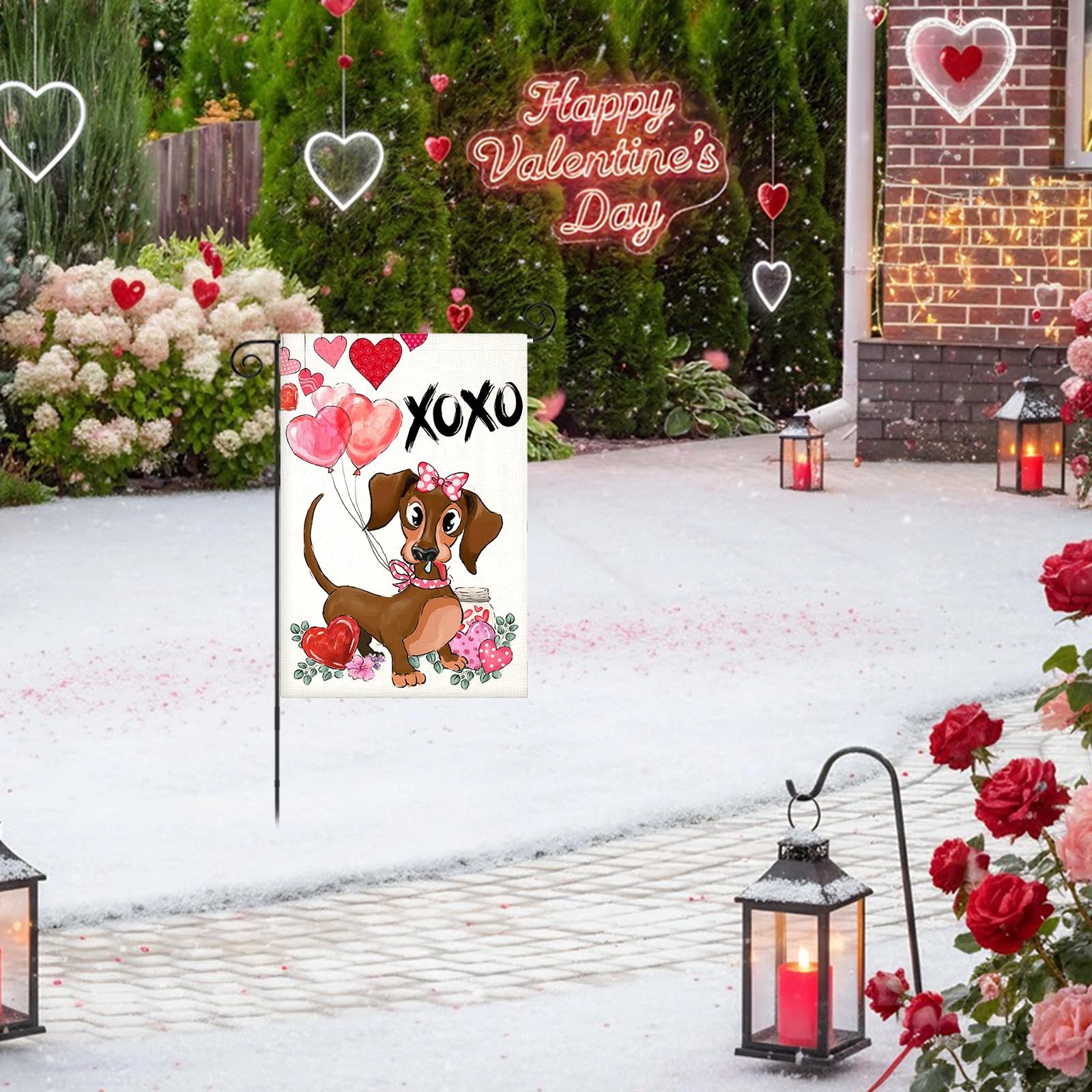 Valentines Day Garden Flags for Outside, Dachshund Dog with Balloons Small Seaso