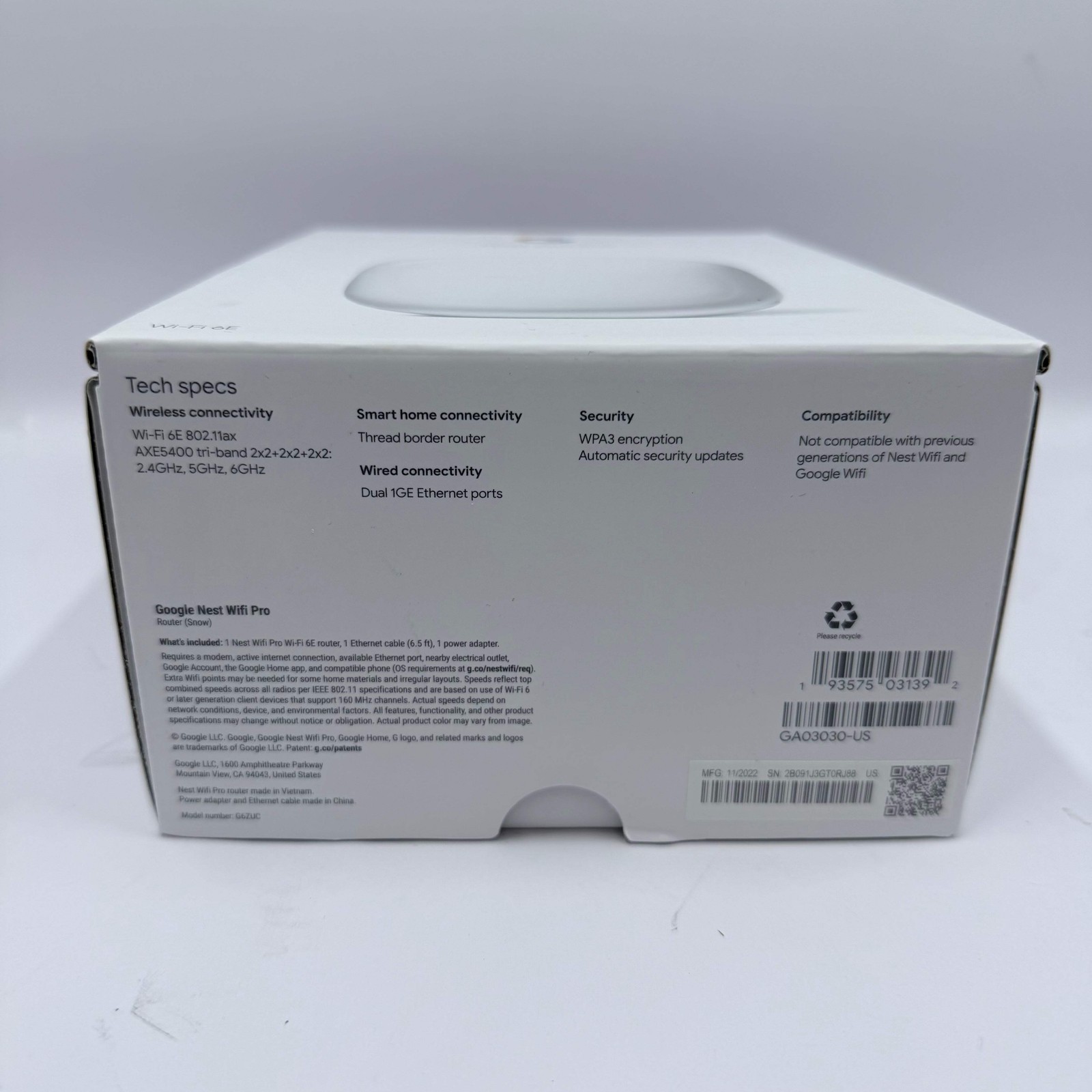Google Nest Wifi Pro Router GA03030-US Wi Fi 6E