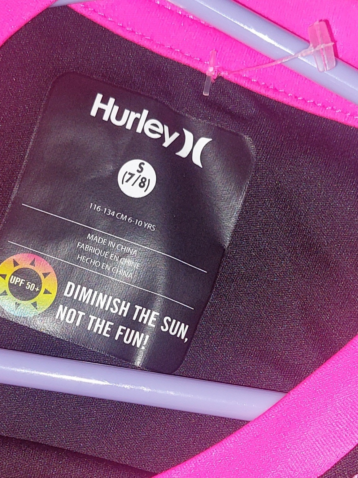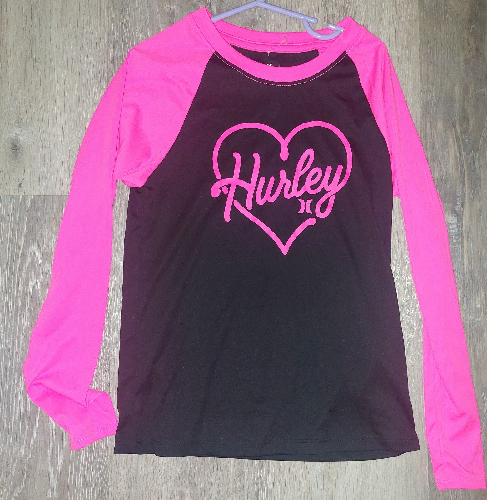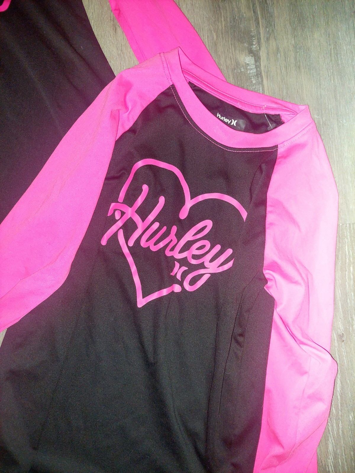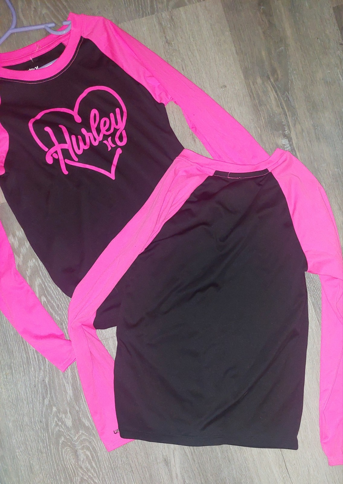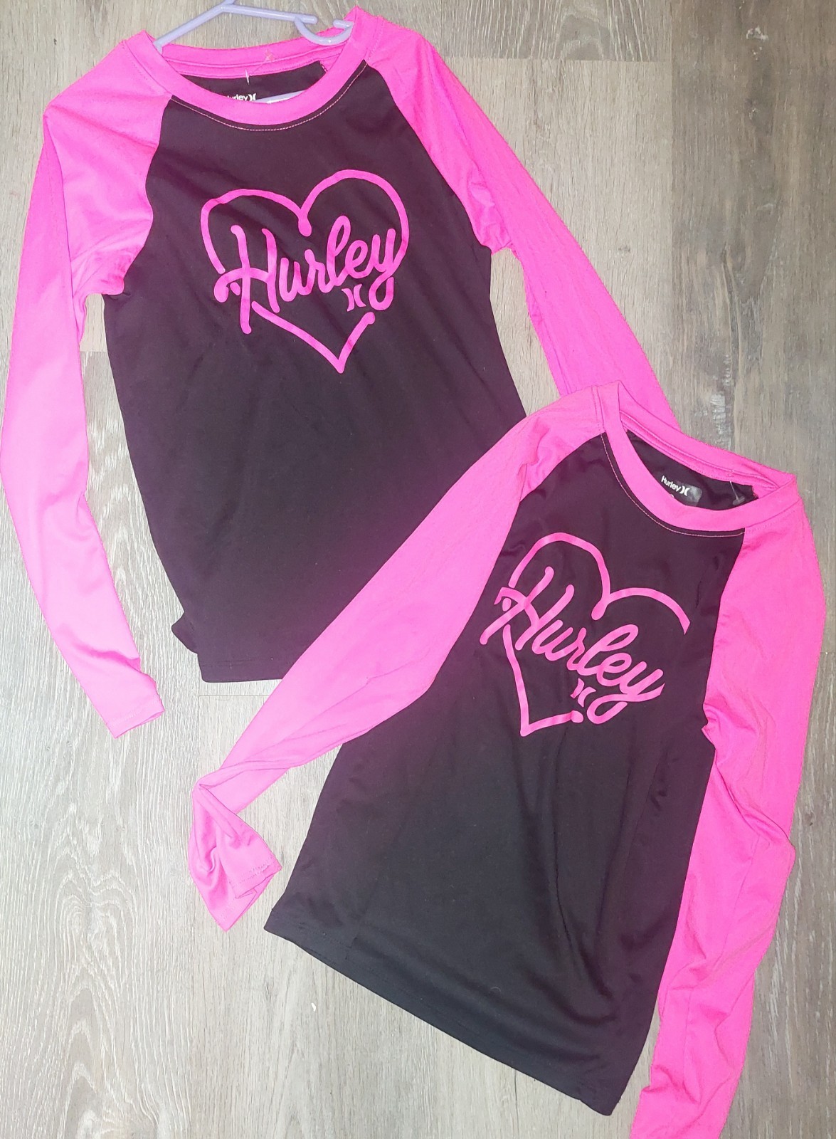 2 Hurley Girls Moisture Swim Shirt Rash Guard Black Pink w/ Heart Logo Sz 7/8