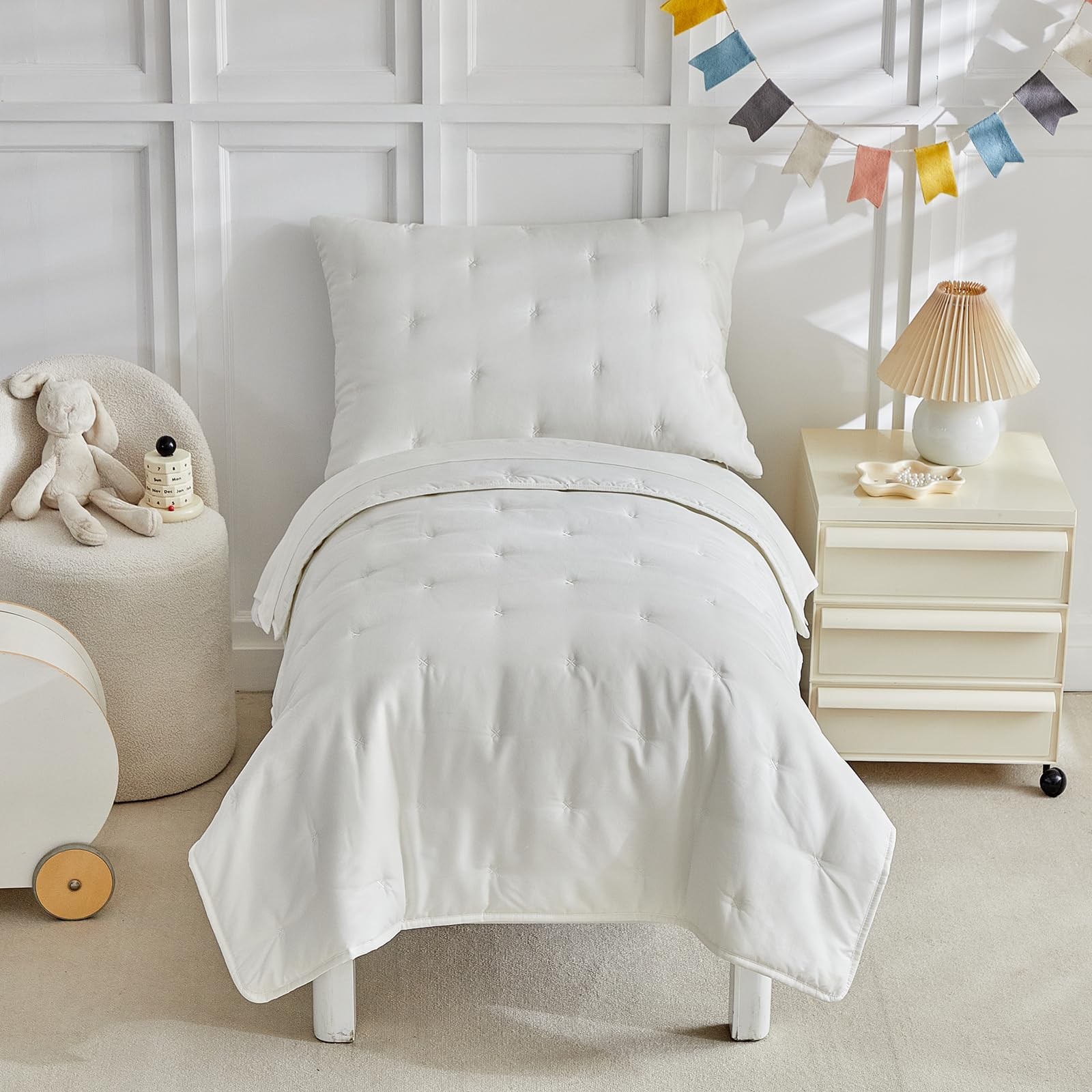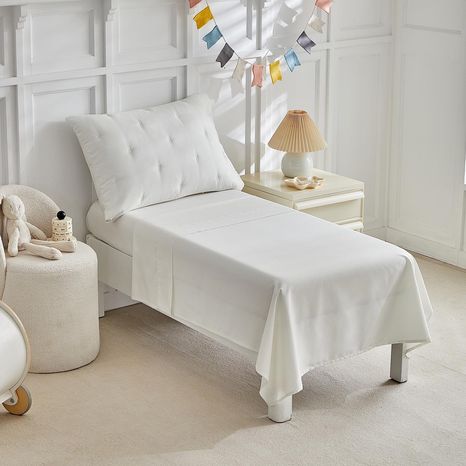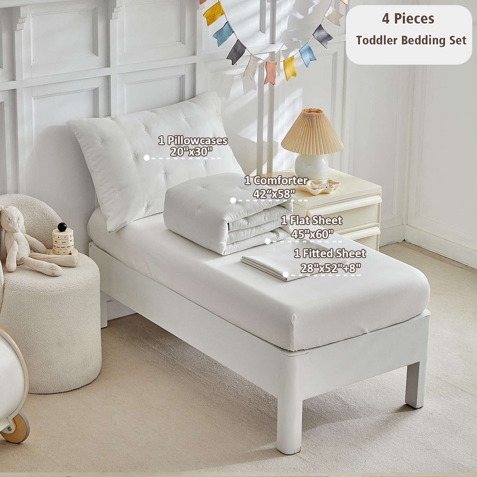 White 4 Piece Bedding Set for Boys Girls,Embroidery Microfiber Crib Bed Sheet...