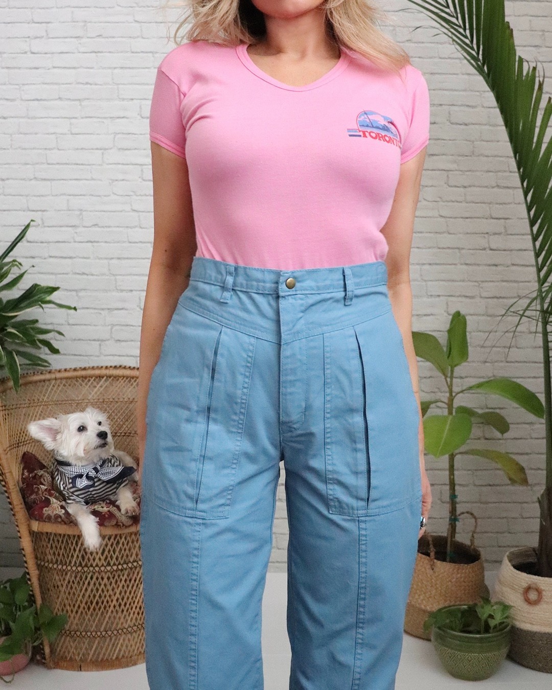 70s Dusty Blue Cotton Pants 28 To 29 W x 35 L Vintage Deadstock High Waist