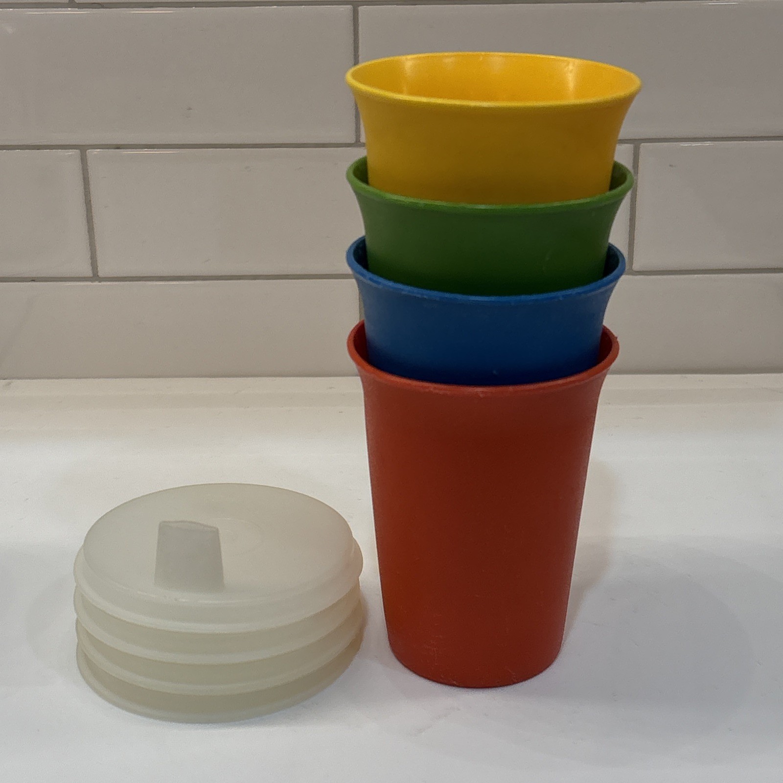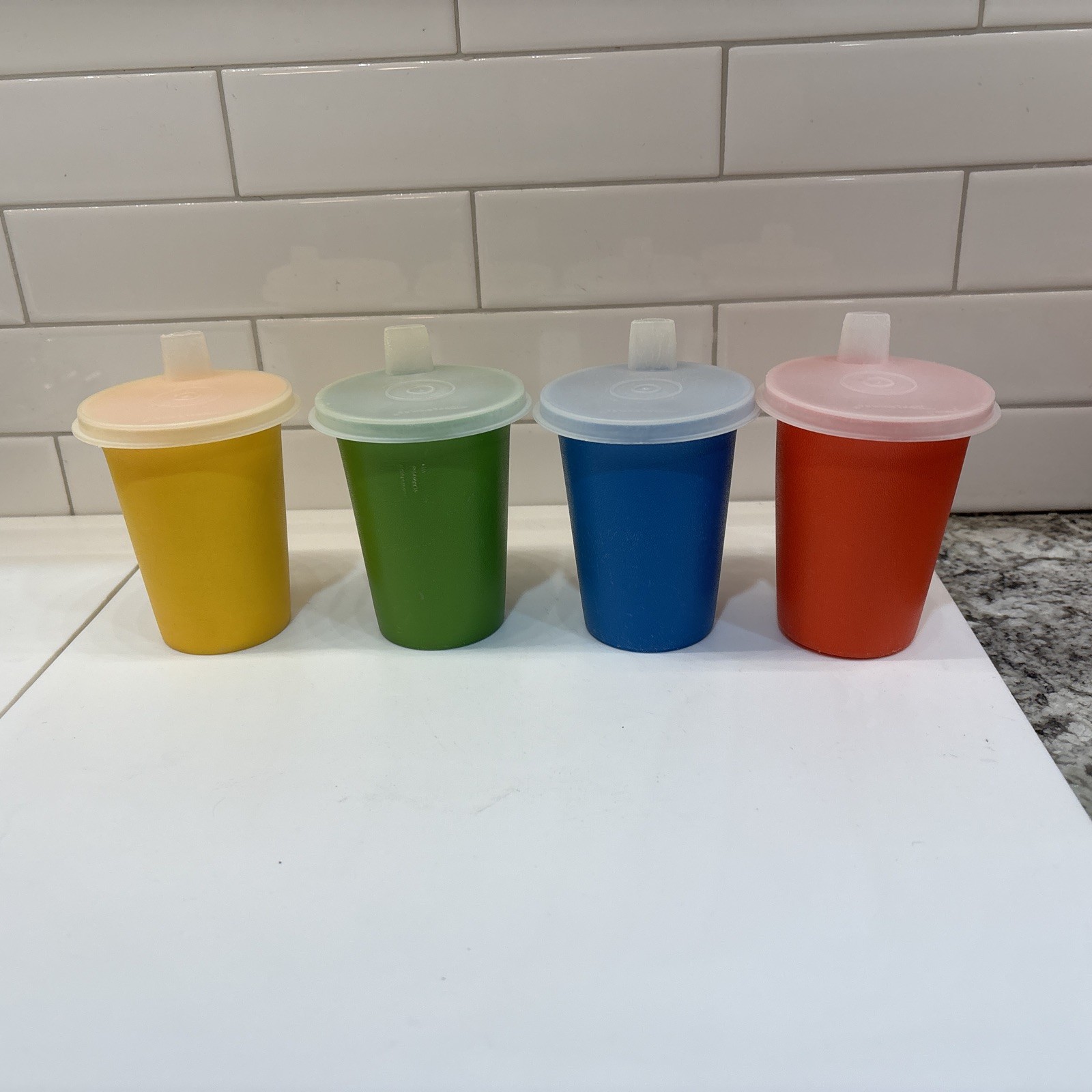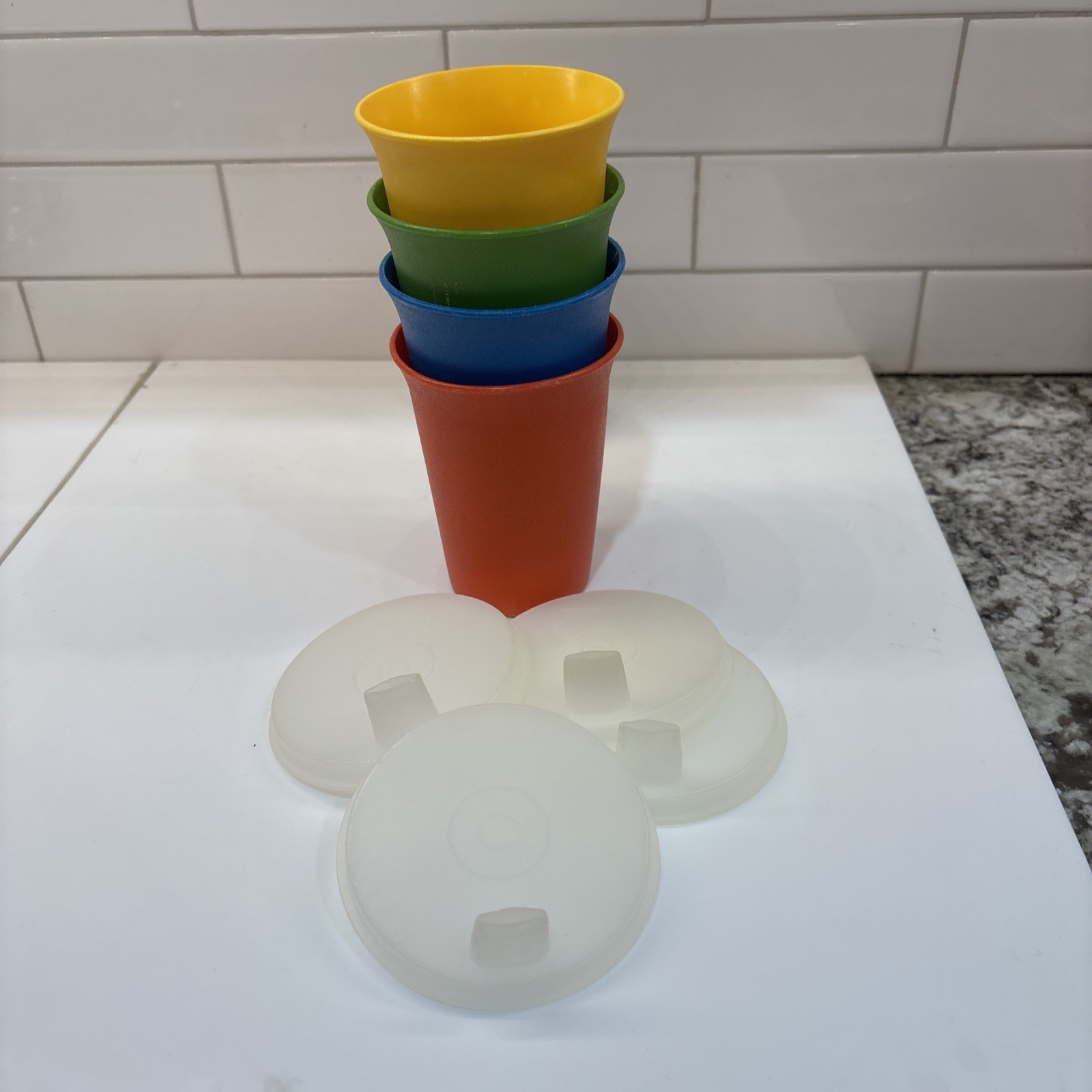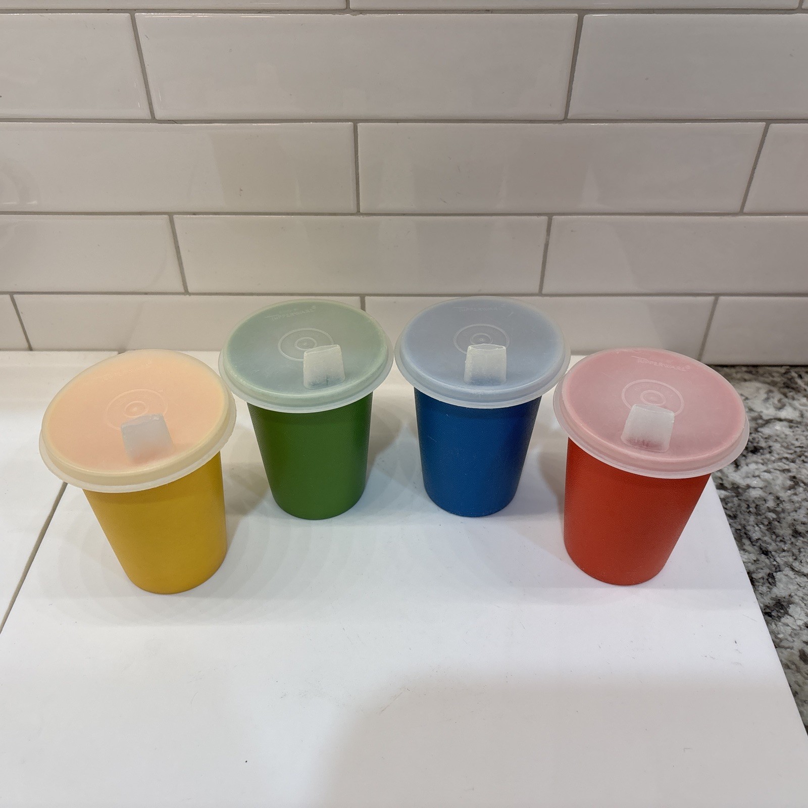 • Lot Tupperware Bell 4 Cup Set Kids 7 oz Tumblers Sippy Primary Colors Lids 109