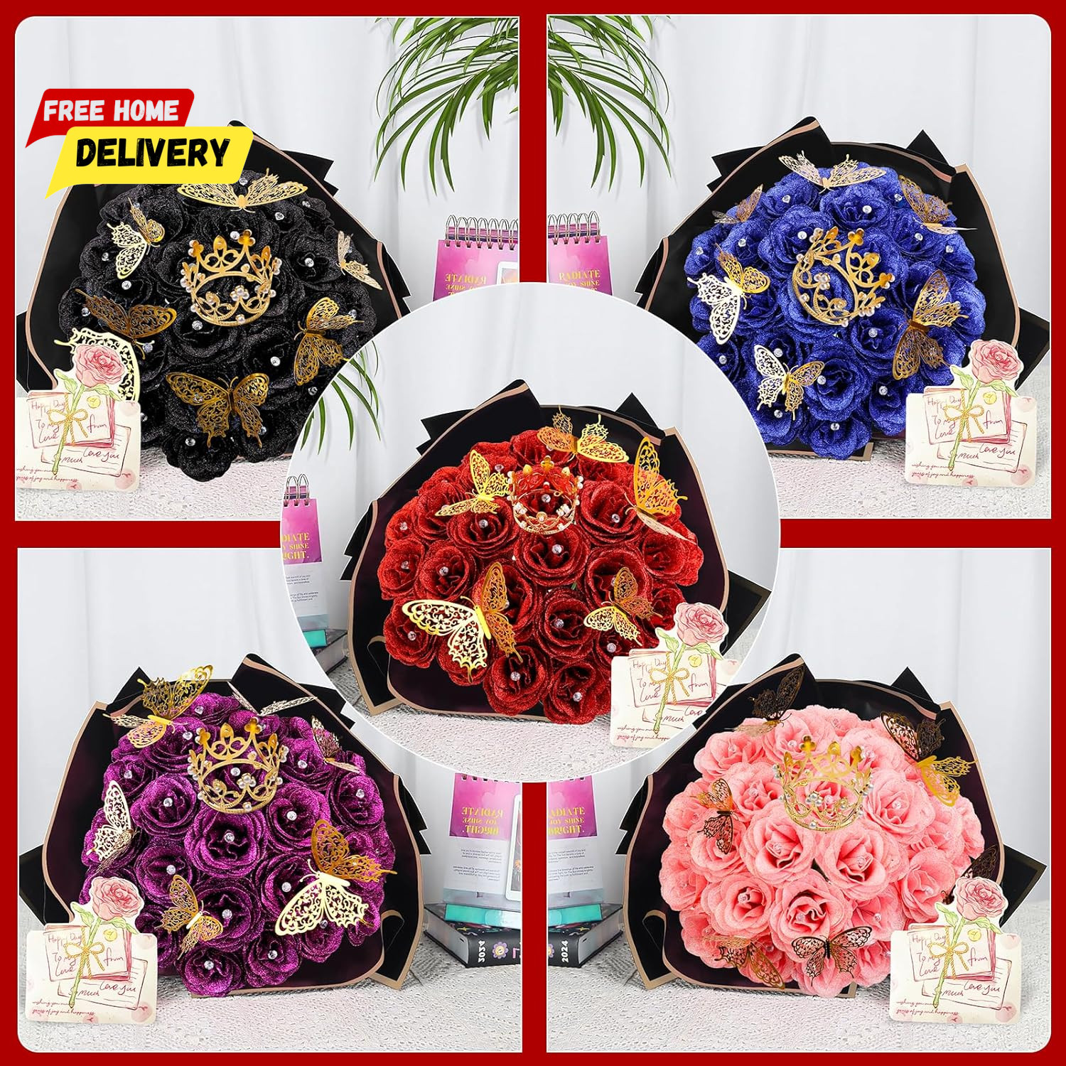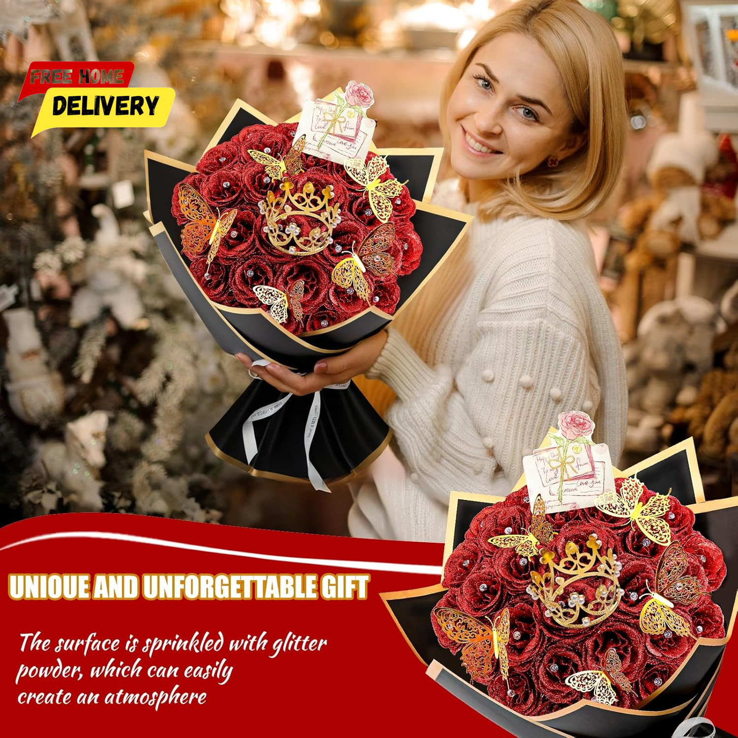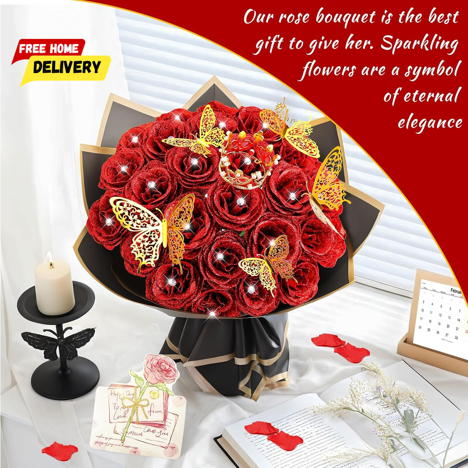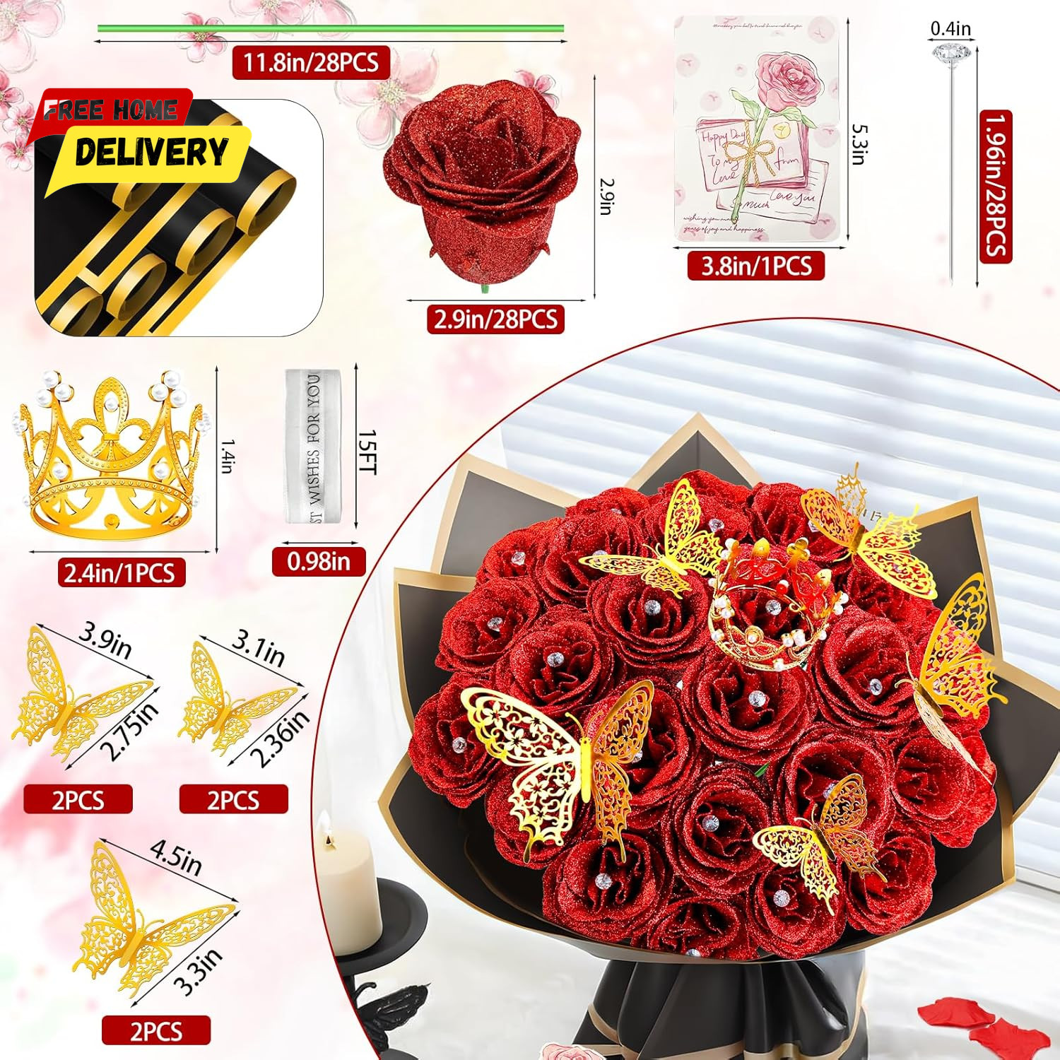 28 Red Glitter Roses Bouquet - Artificial Flowers Bouquet with Diomand Pins, Red