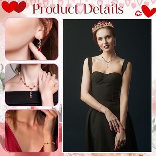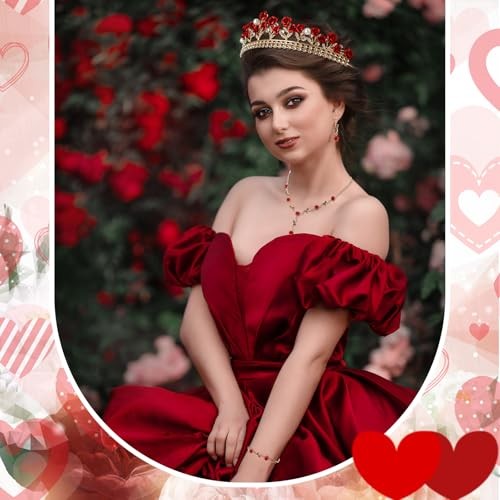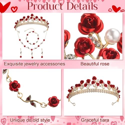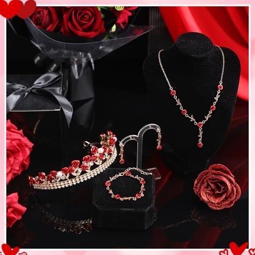 4 Pcs Valentine's Day Rose Jewelry Set Women Bridal Tiara Red and Gold