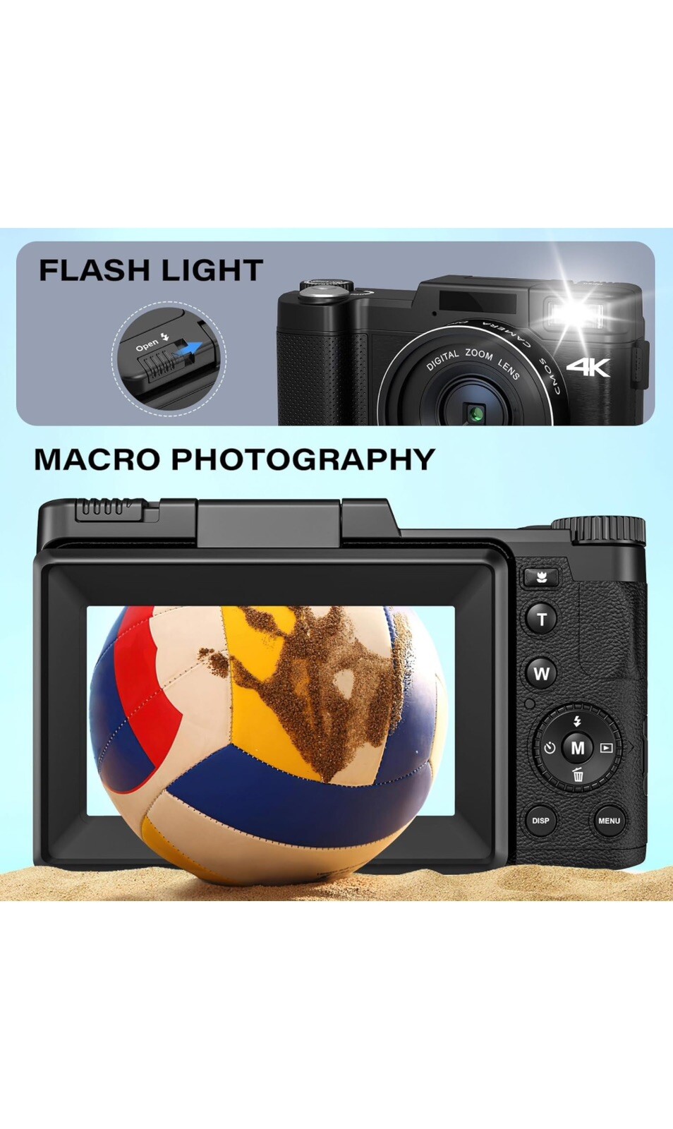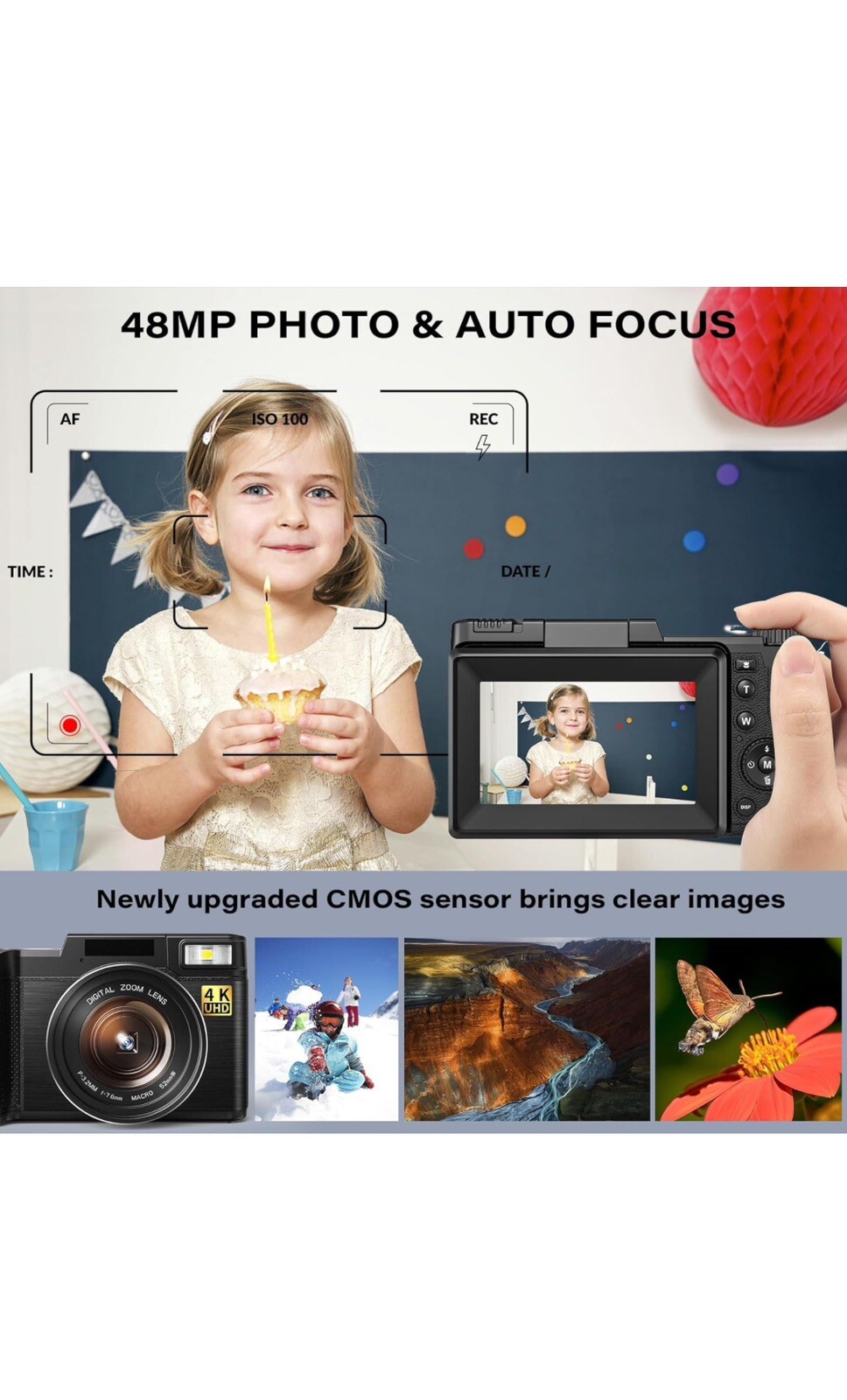 Toiauaha 4K Digital Camera for Photography, Autofocus 48MP 16x Zoom, 3 180 Degr