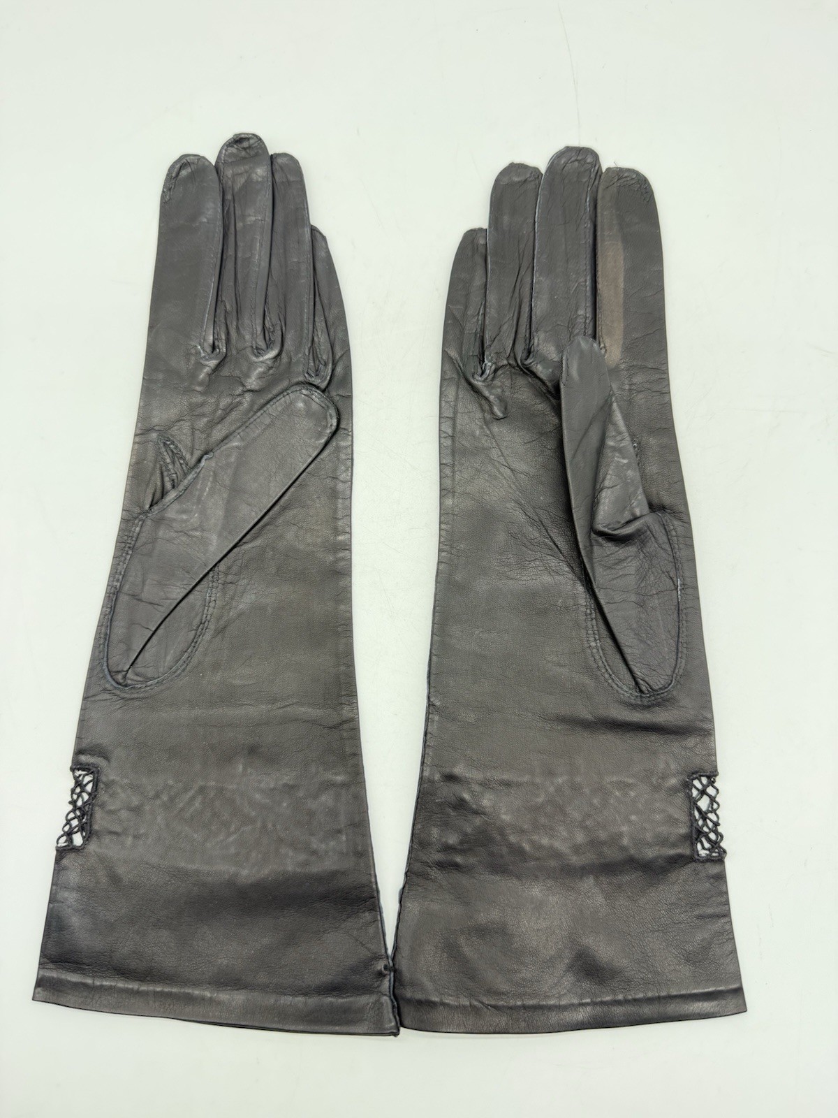Vintage Women s Black Leather Evening Gloves Cut Out Floral Lace Gothic Sz 7.5