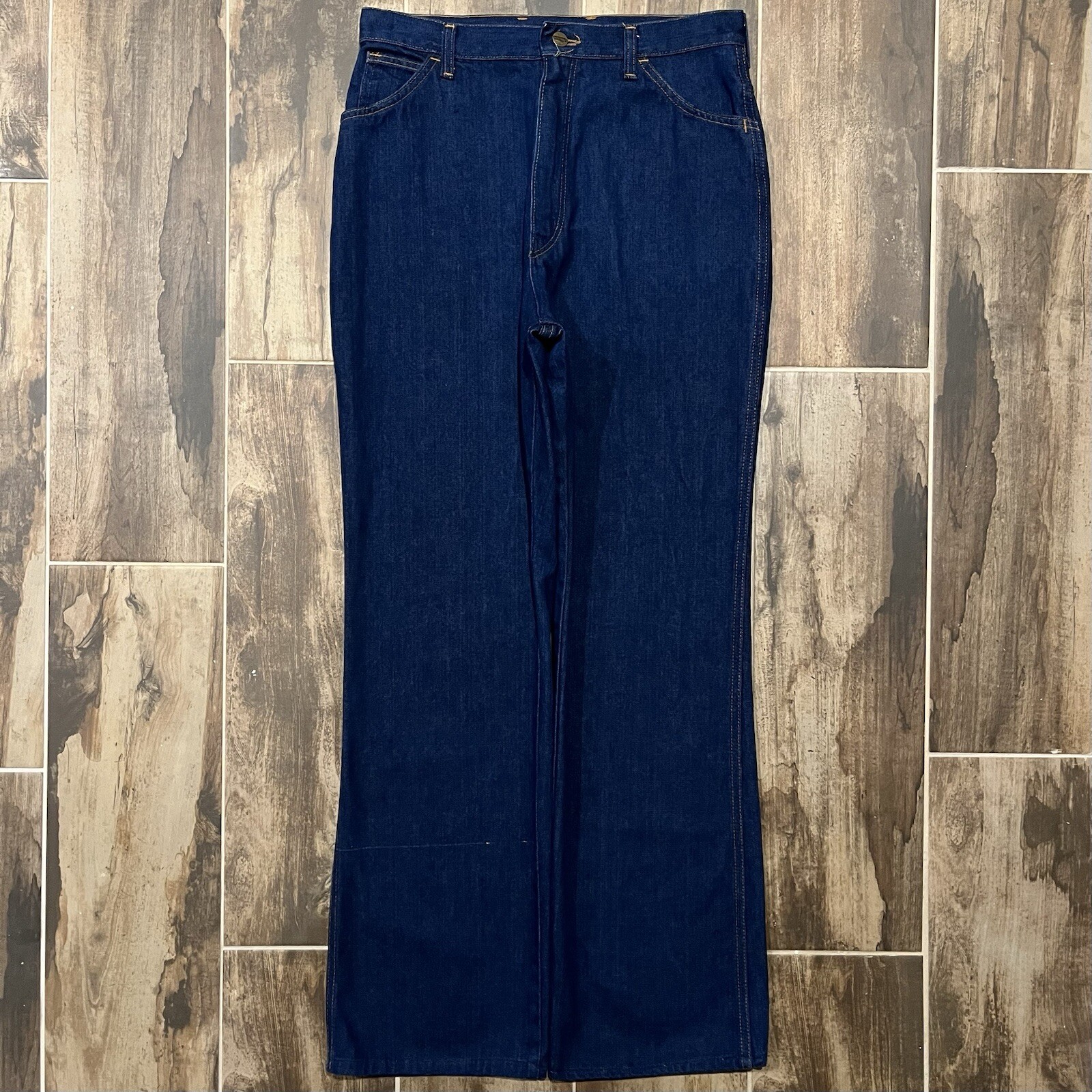 как выглядит Vintage Made In USA 70s Wrangler No-Fault Dark Wash Denim Blue Flare Jeans фото