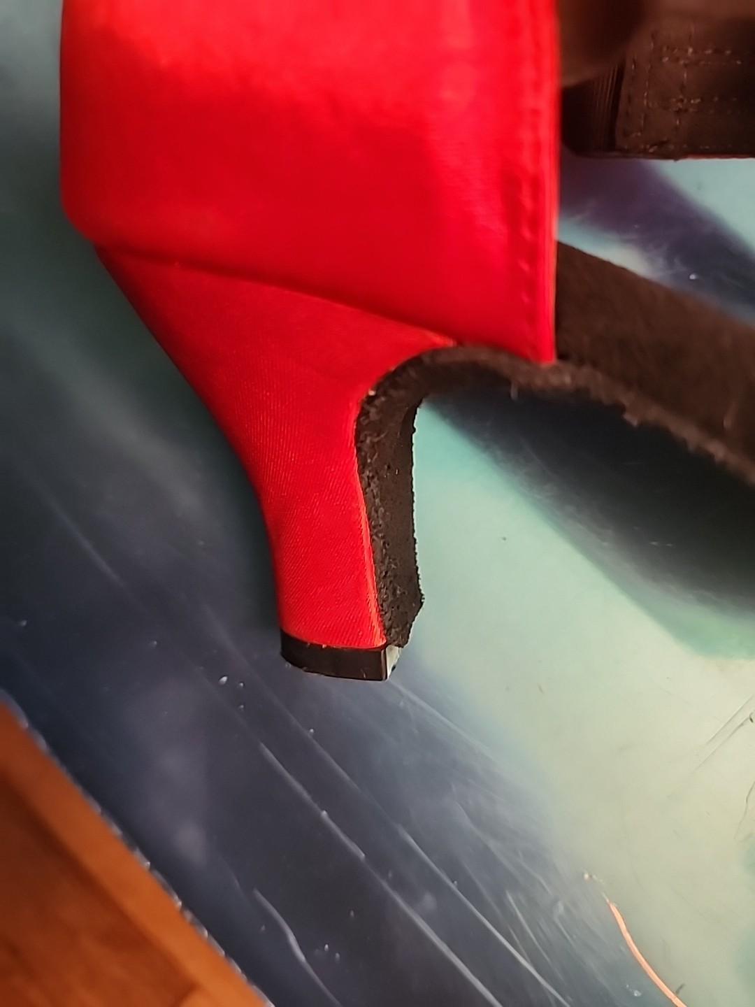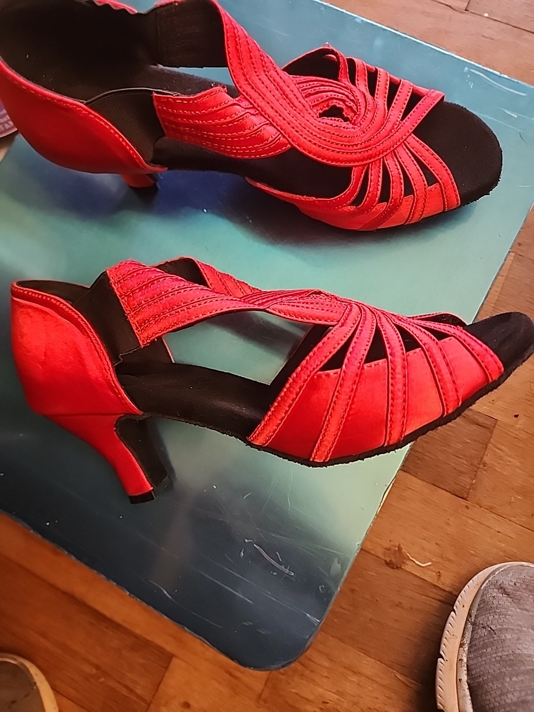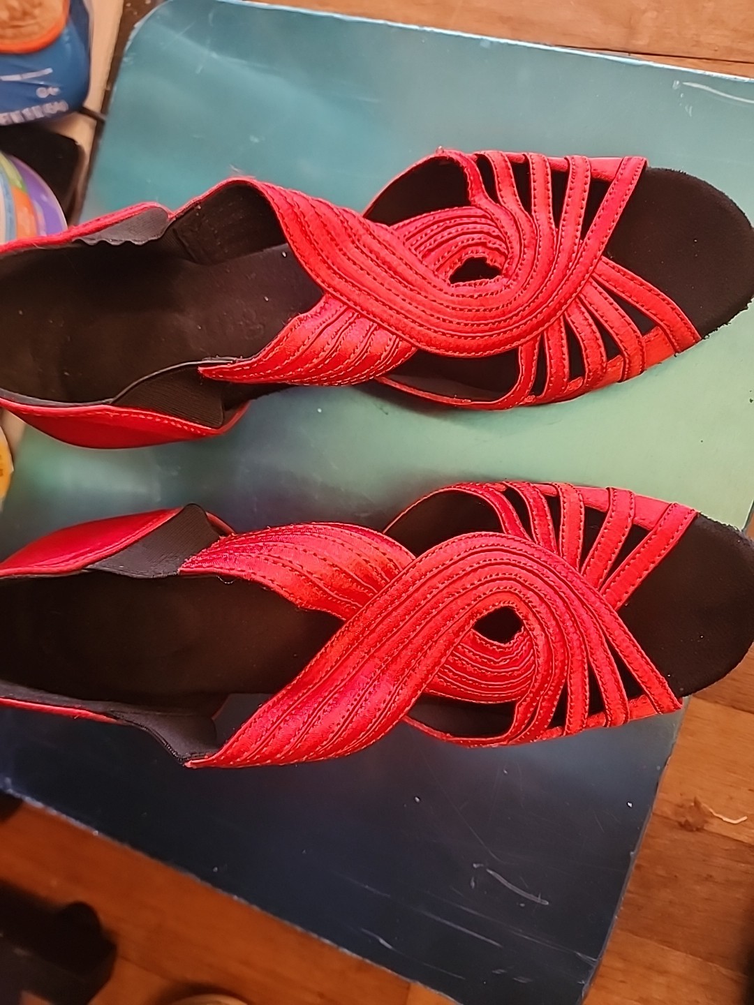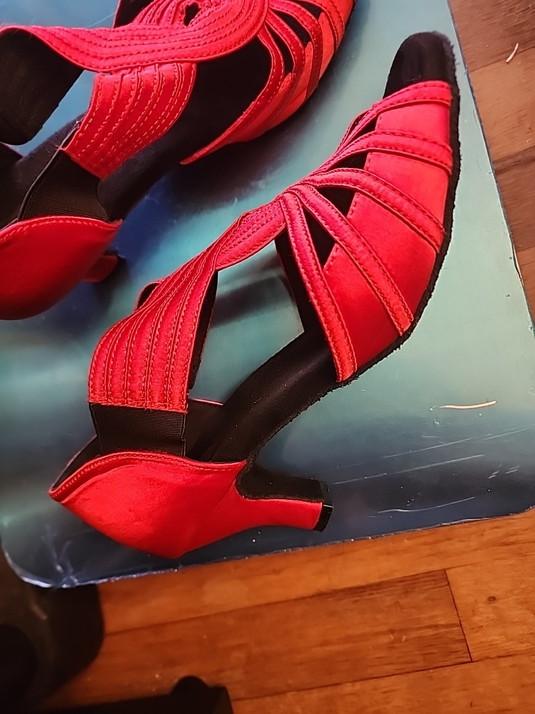 как выглядит Womens Red Satin Latin Dance Shoes with a flared heel, commonly used for salsa, фото
