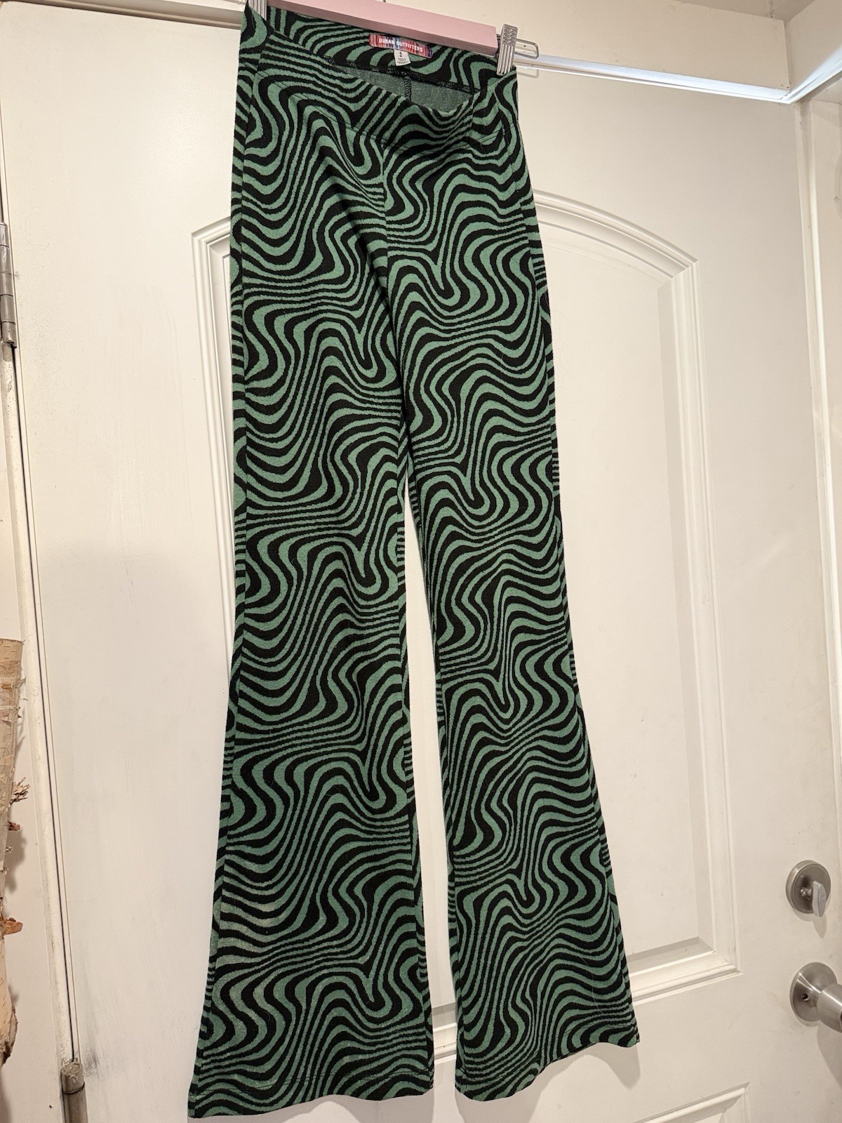Urban Outfitters Flare Pants /Black Green Wavy Pattern Sz Small Groovy