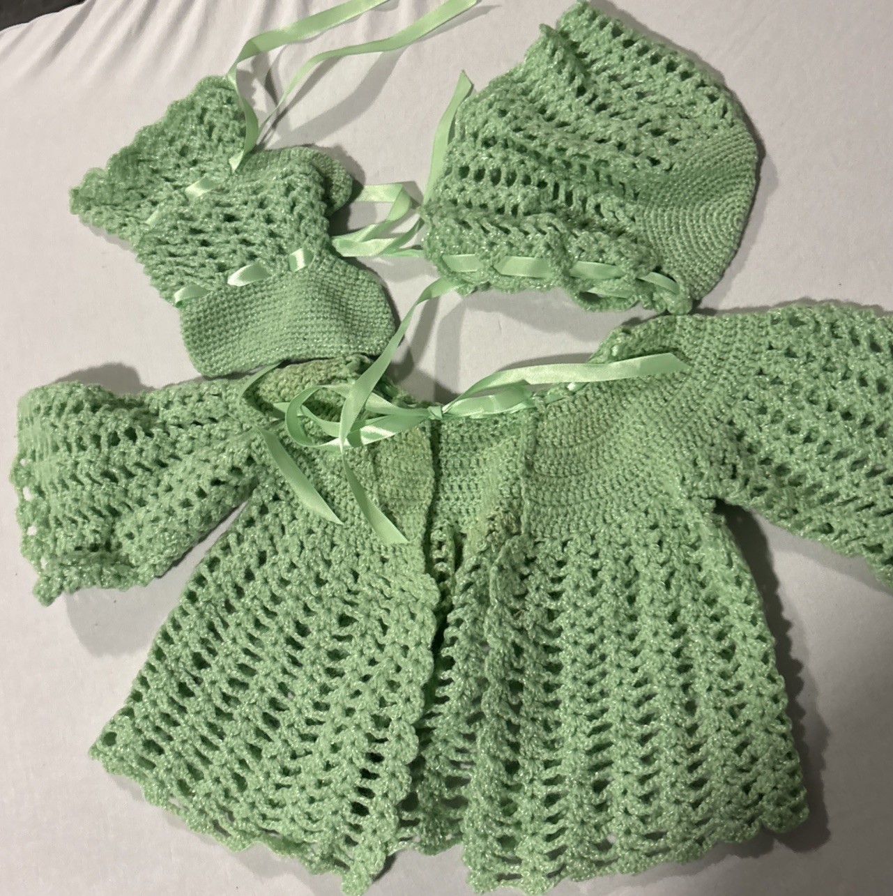 как выглядит Vintage Hand Knit Baby Sweater Booties And Hat Set Light Green фото