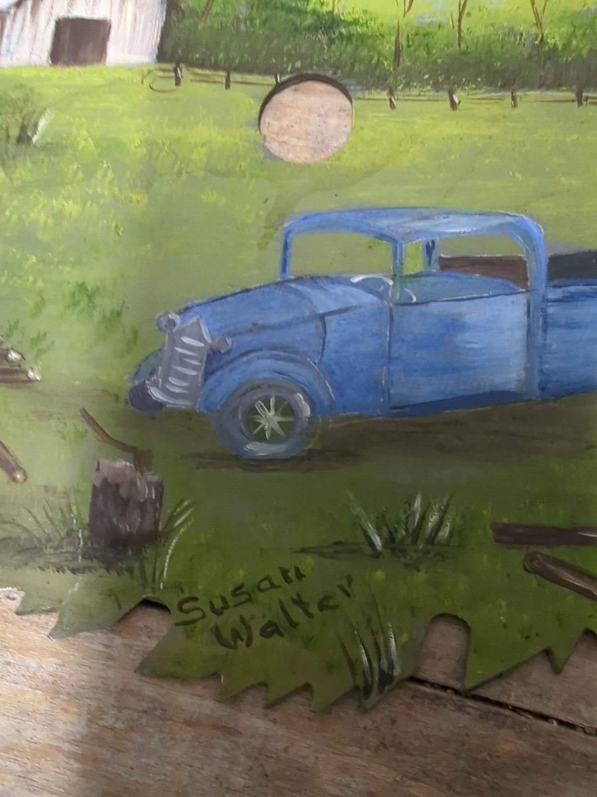 как выглядит Vintage Round Saw Blade Hand Painted Signed Country Barn Truck Scene 7.5 InRound фото