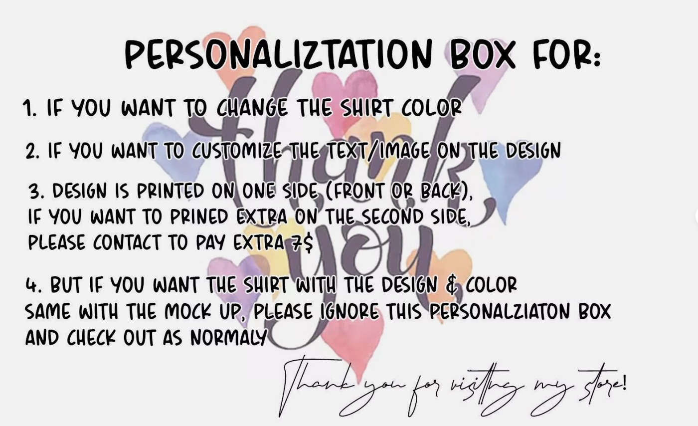 Personalization Instructions: We have colors (Black, White ,Light/Royal/Navy Blue ,Charcoal ,Red , Grey ,Maroon ,Dark Heather, Pink ,Sand , Green, Purple , MILITARY GREEN , ASH GREY, ORANGE ) , (BACK/FRONT) . Pls leave note here