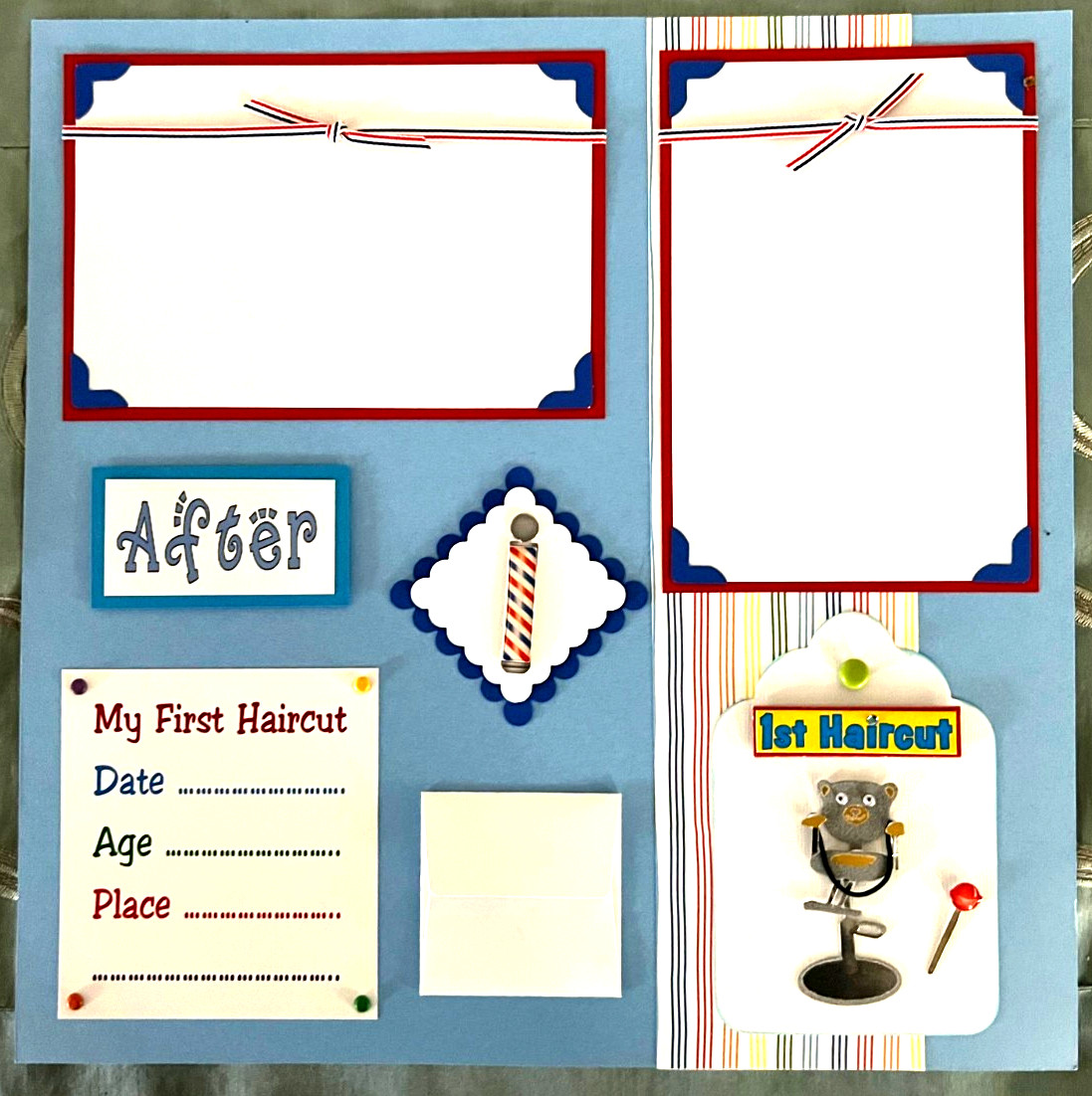 TWO MY 1ST HAIRCUT PREMADE SCRAPBOOK PAPER PAGES 3-D EMBELLISHMENTS