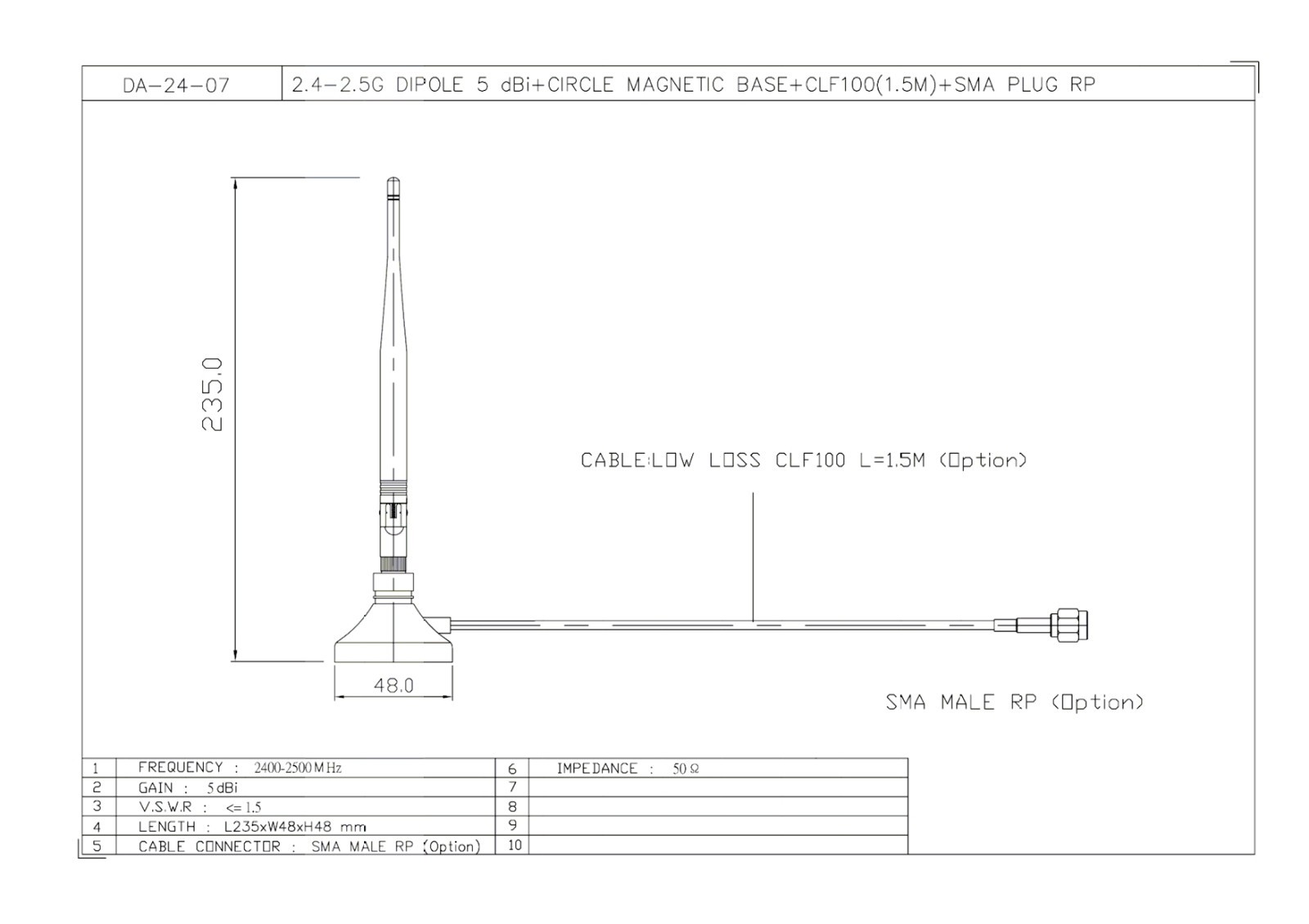 High-Gain WiFi Dipole Swivel Antenna w/Magnetic Base 2.4GHz SMA Male 1.5M Cable