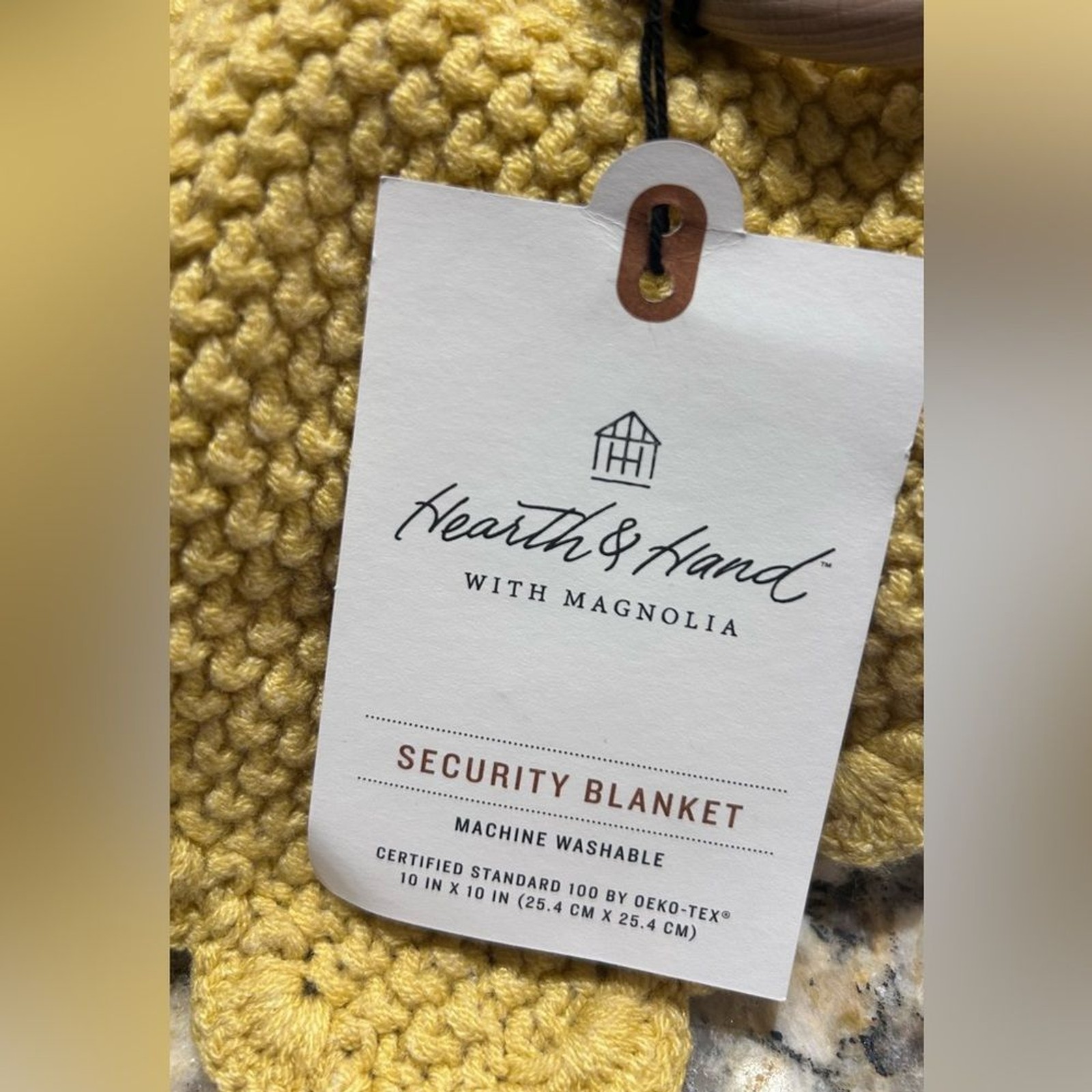 как выглядит Hearth Hand Sunny Yellow Knit Baby security blanket lovely with wood ring NWT фото