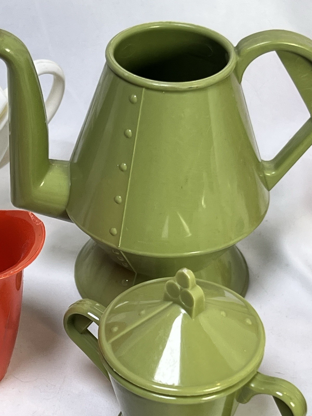 как выглядит Vintage Kids Childs Play Kitchen Plastic Dishes Cups Teapot Bundt pan 27 Pieces фото