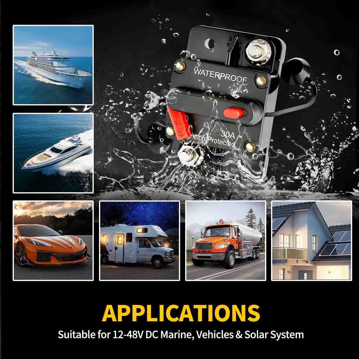 30-amp circuit breaker, DC 12V-48V, suitable for marine and trawling motors.