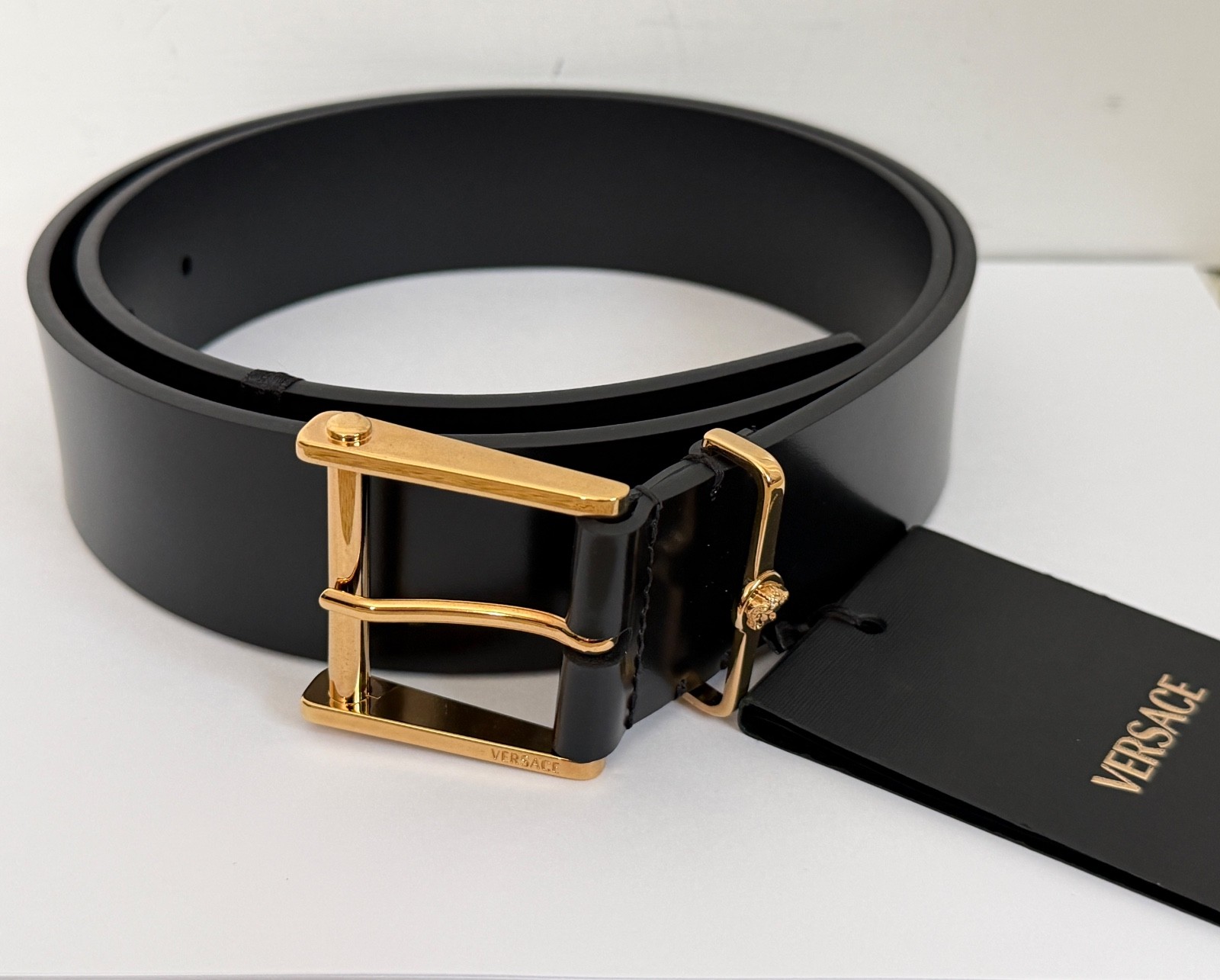 как выглядит NWT Versace Column Medusa Logo Gold Buckle Wide Black Leather Belt 90 US 36 675 фото