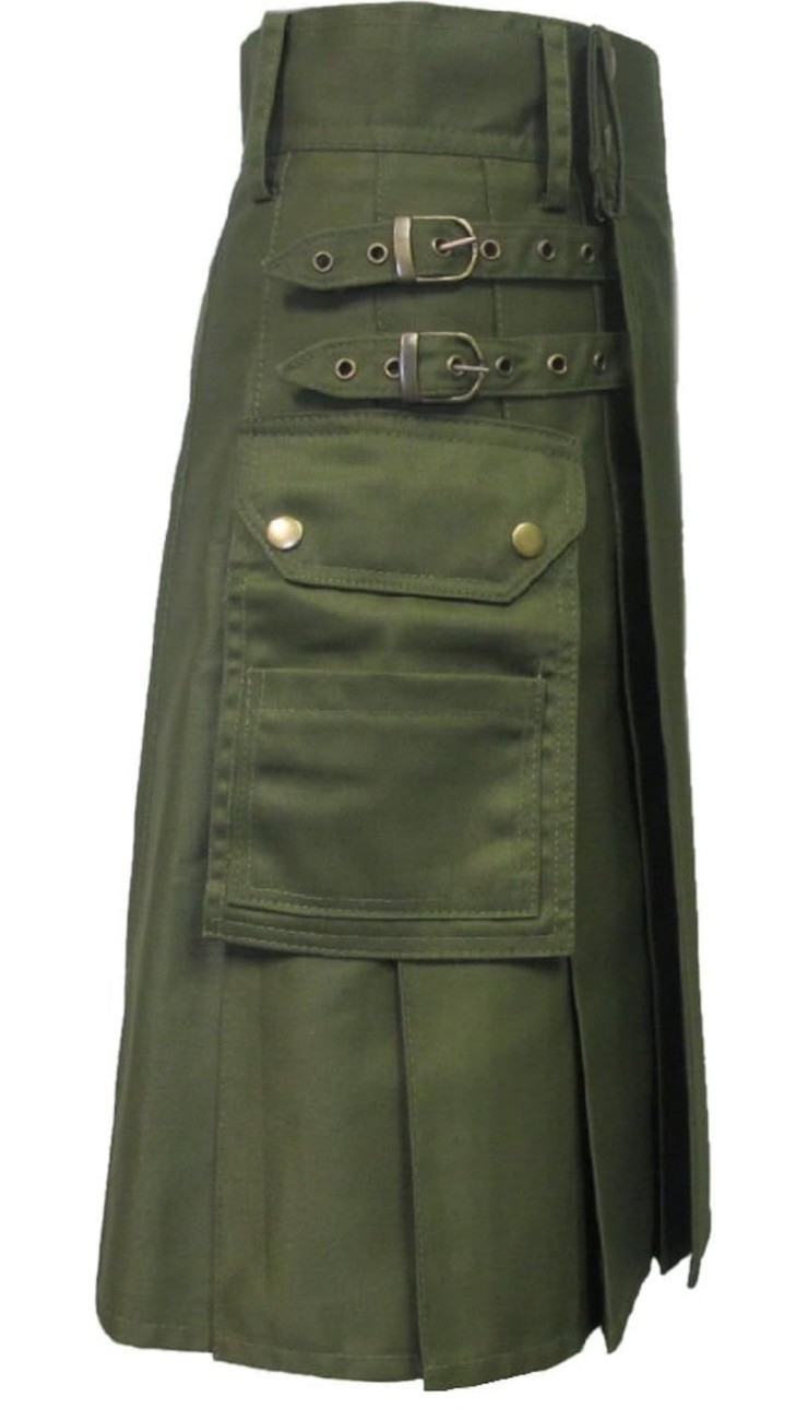 Men's Cotton Scottish Utility Kilt Cargo Pockets Kilt Tactical Duty Olive Green