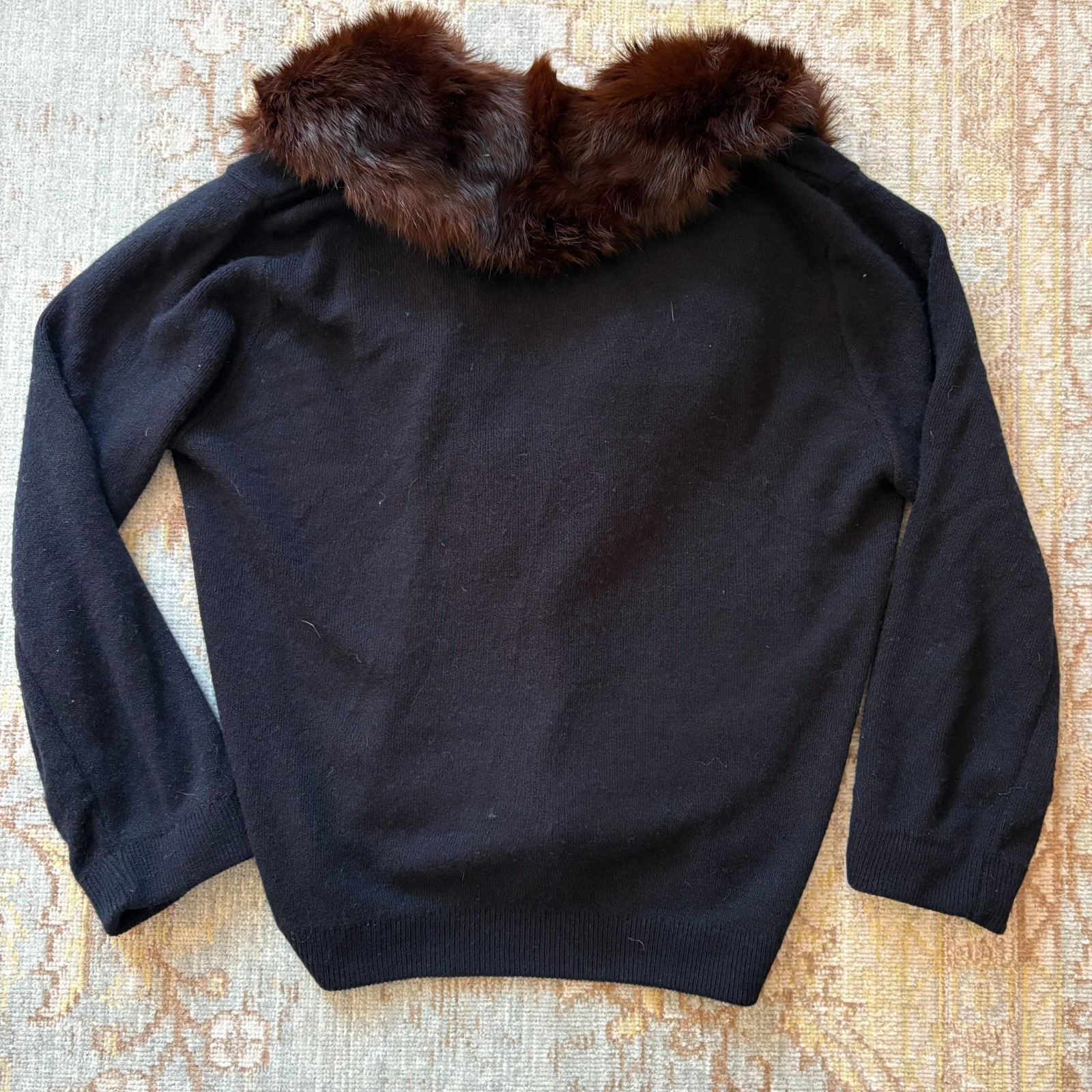 Vintage 50s Black Cardigan Sz S Sweater Fur Collar Pearl Buttons Cropped Glam