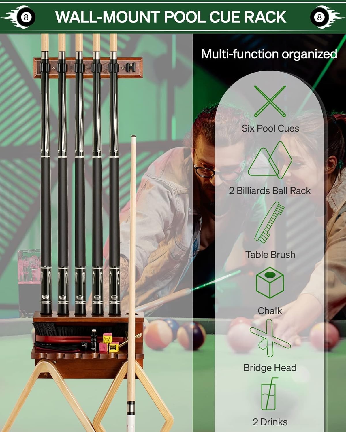 Elegant Wall-Mount Oak Pool Cue Rack for 6 Cues - Stylish Game Room Organizer