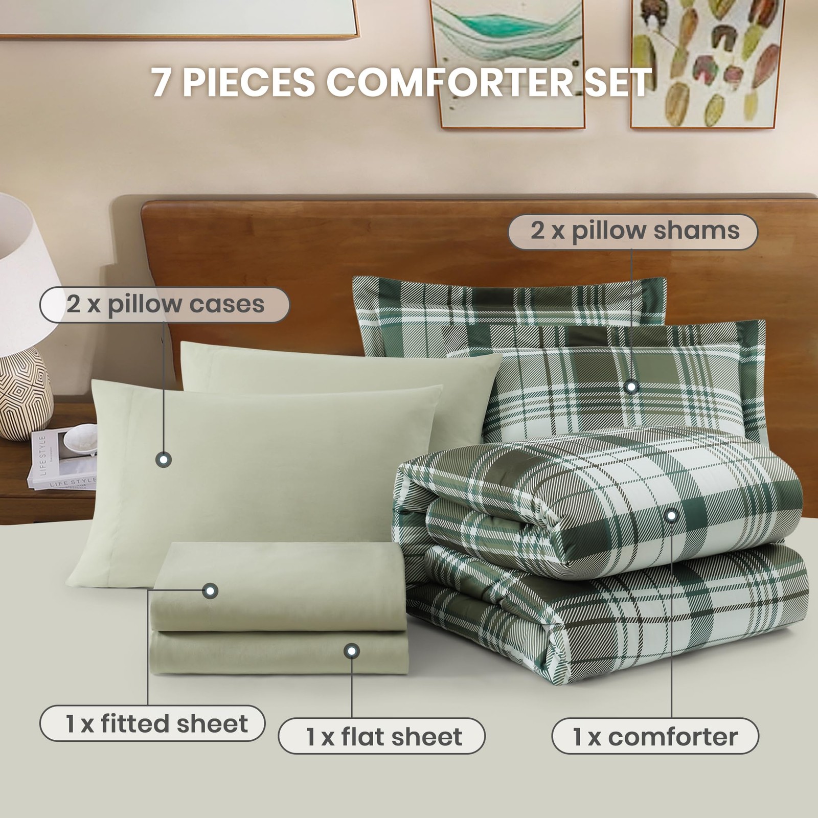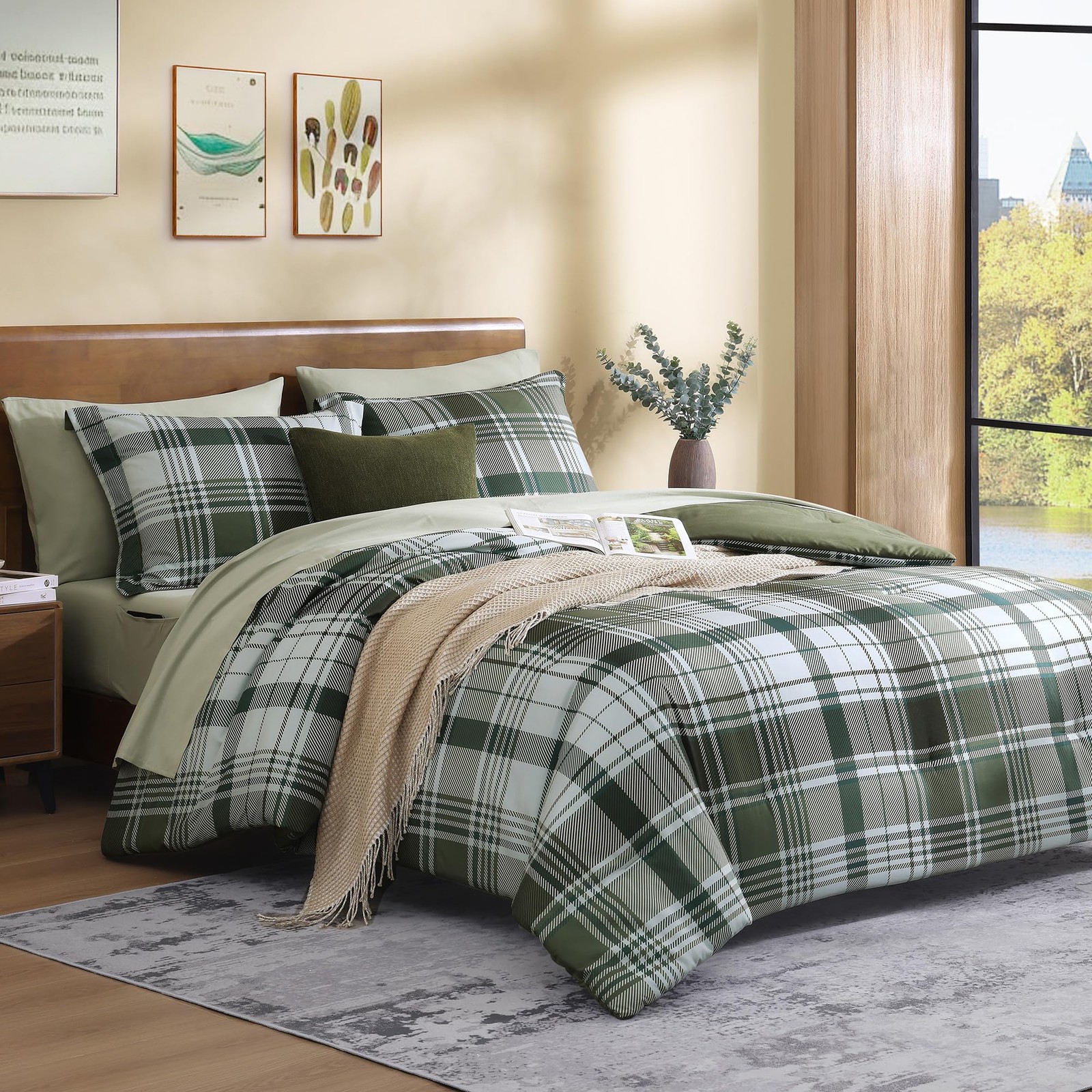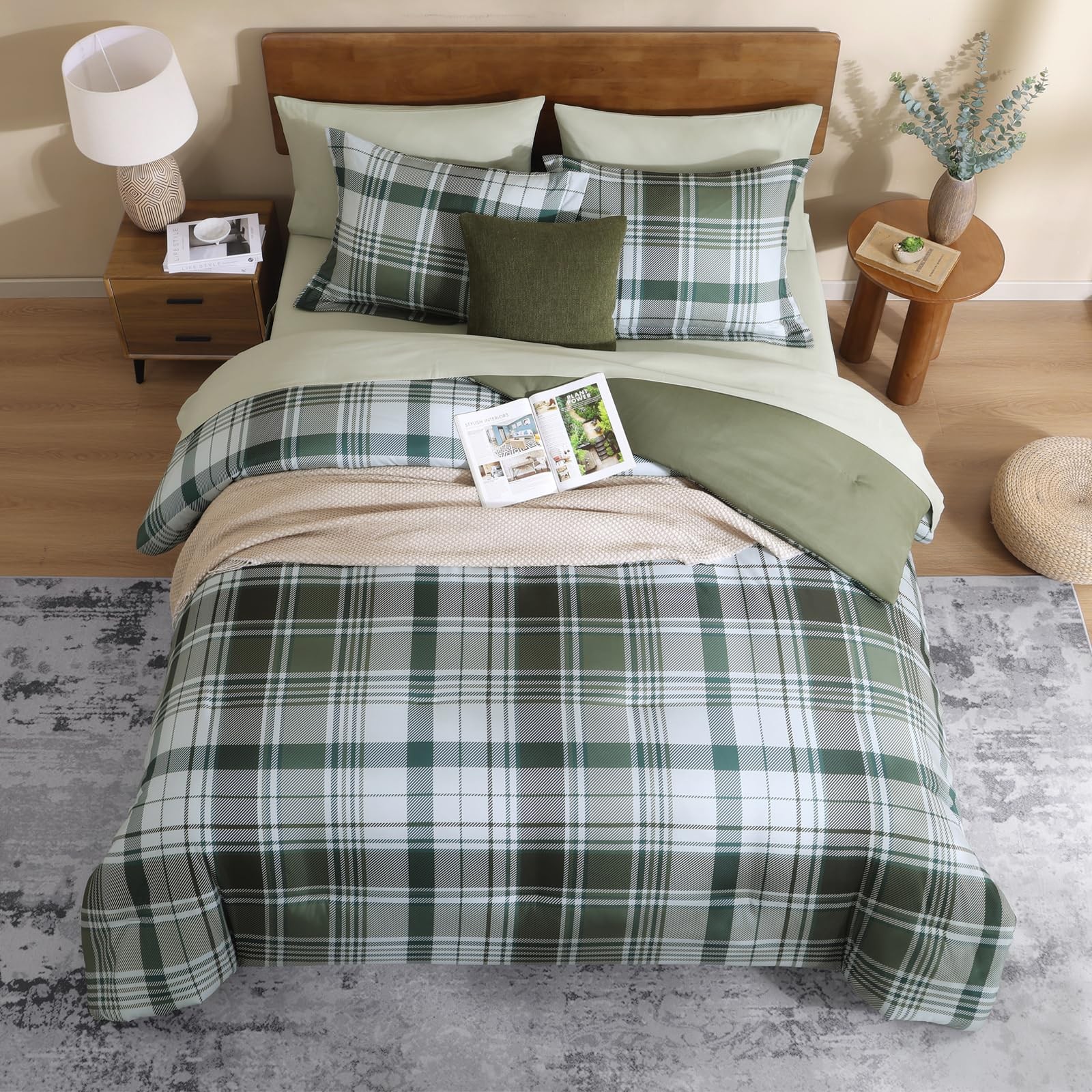 Plaid Queen Comforter Sets Olive Green, Farmhouse Bedding Set Bed in a Bag 7 ...