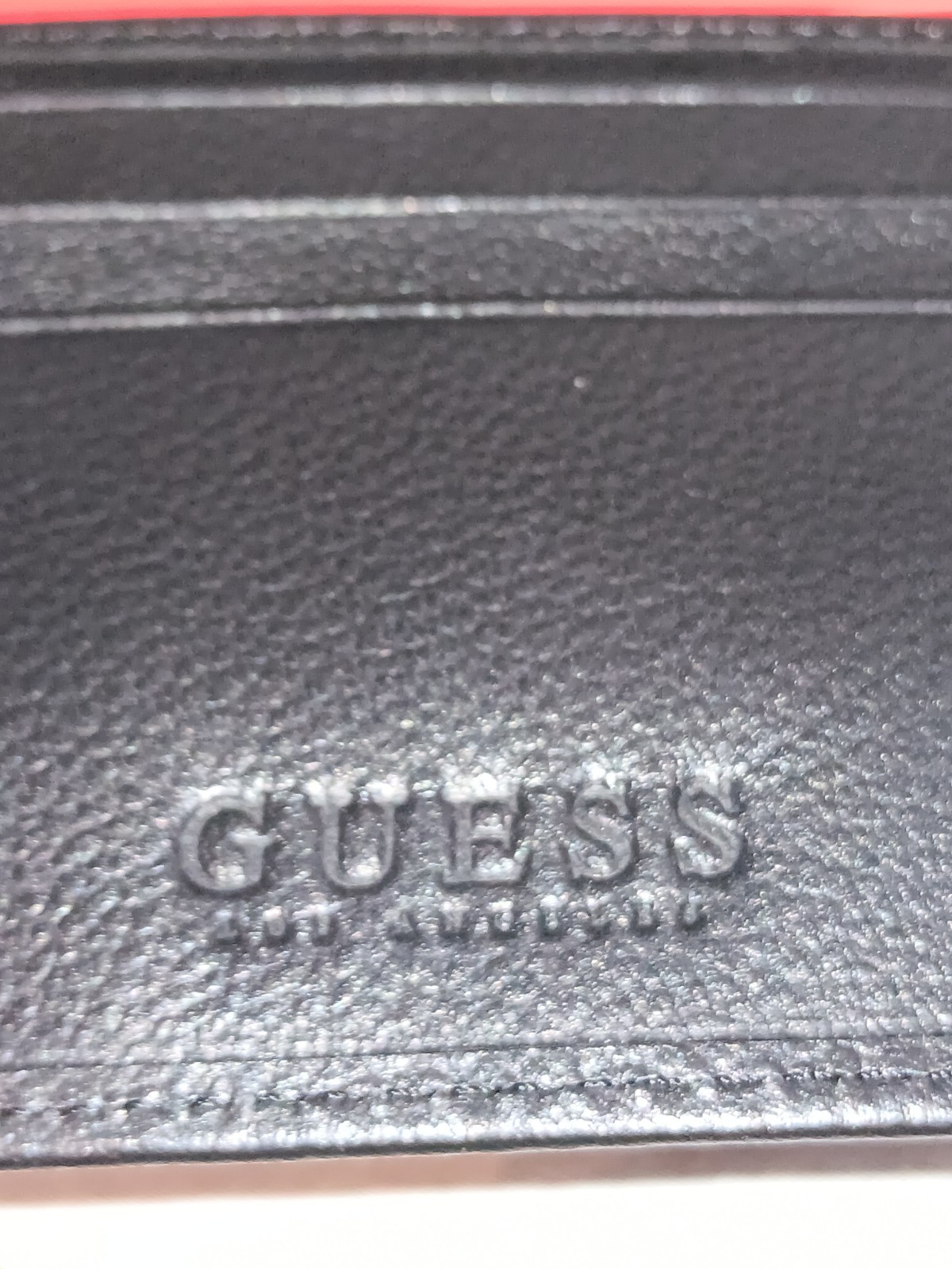 GUESS LOGO MEN'S BLACK LEATHER WITH RED ACCENTS BILLFOLD PHOTO ID WALLET 48 NIB