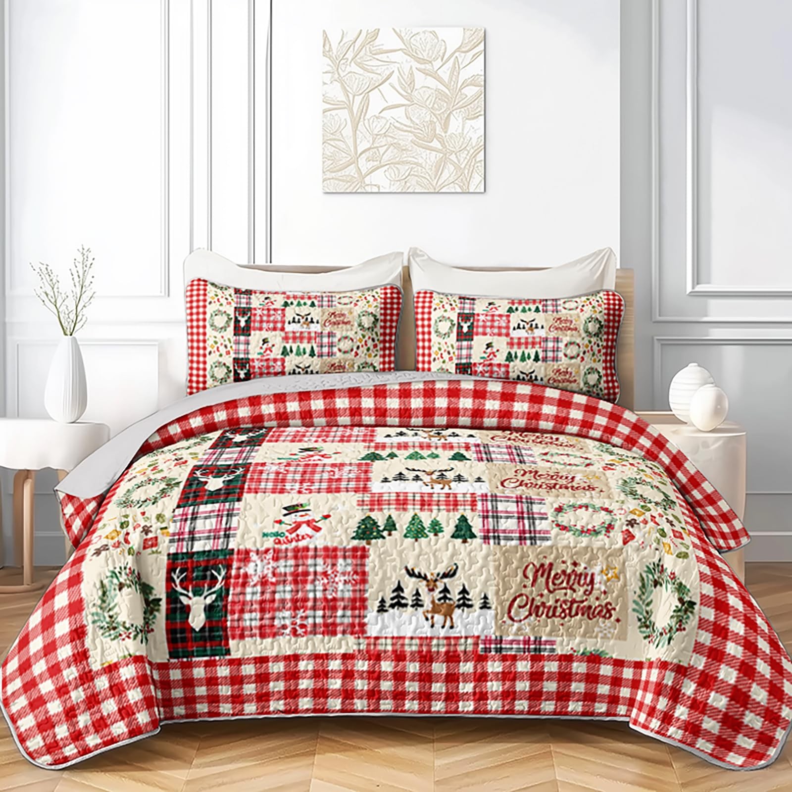Christmas Quilt Set King Size - Plaid Patchwork Bedding with Reindeer and Sno...