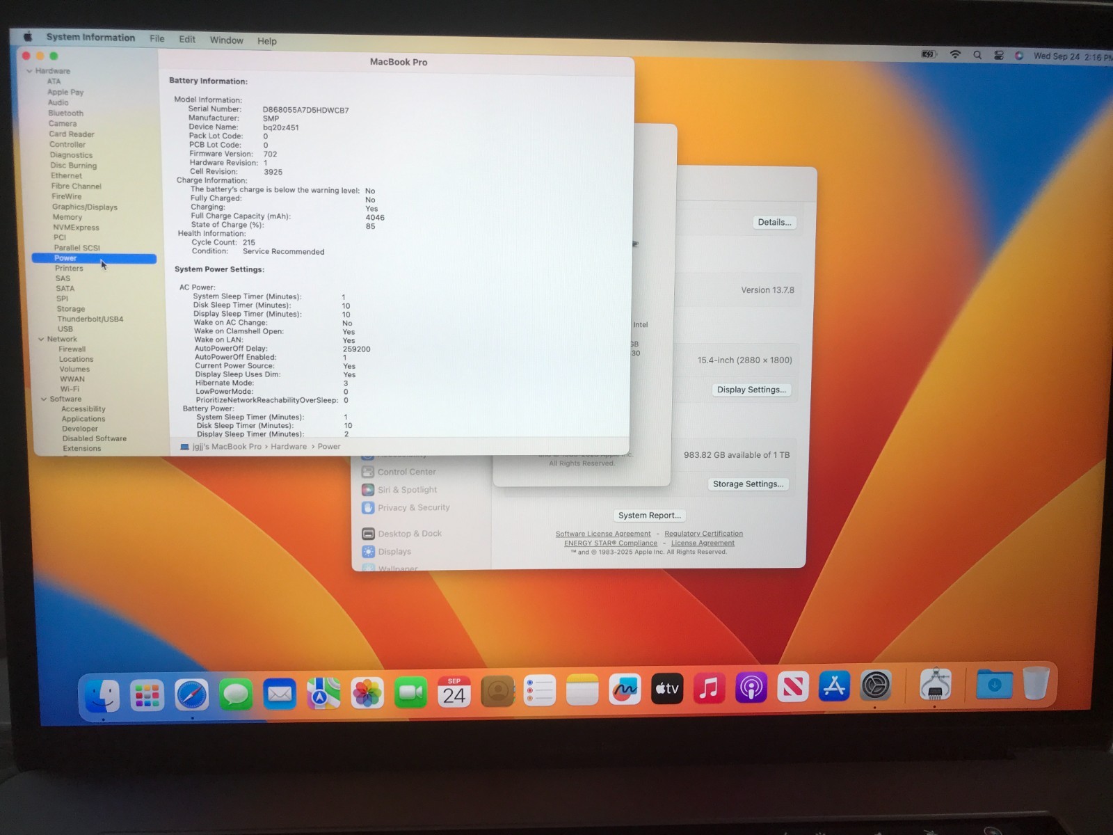 Apple MacBook Pro A1707 2017 15 i7 3.1GHZ 16GB 1TB Gray Service Battery 298