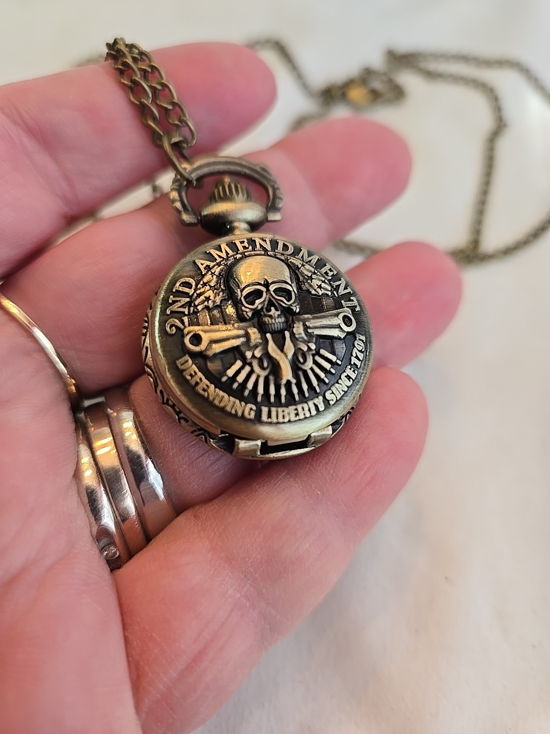 2nd Amendment Pocket Watch Bronze Time Necklace Pendant Jewelry USA New Battery