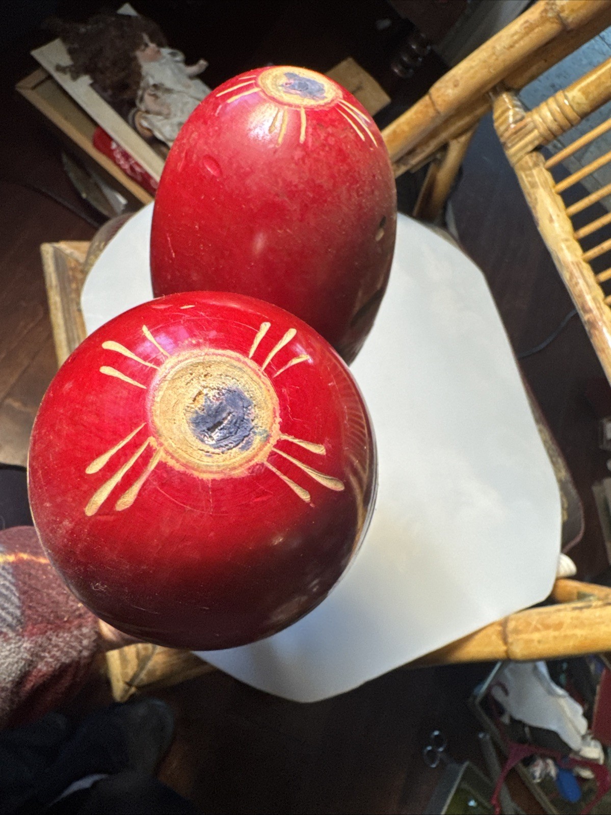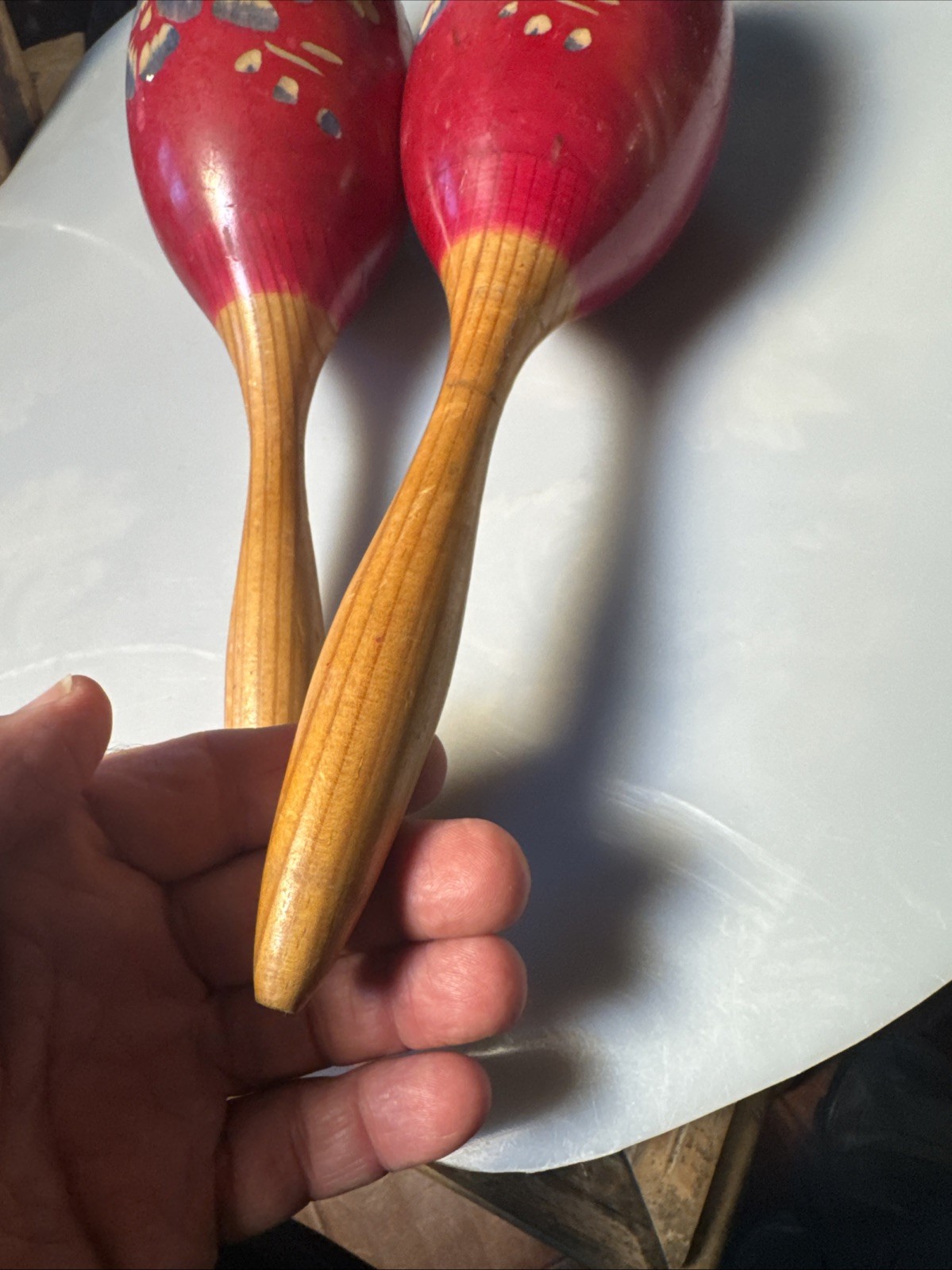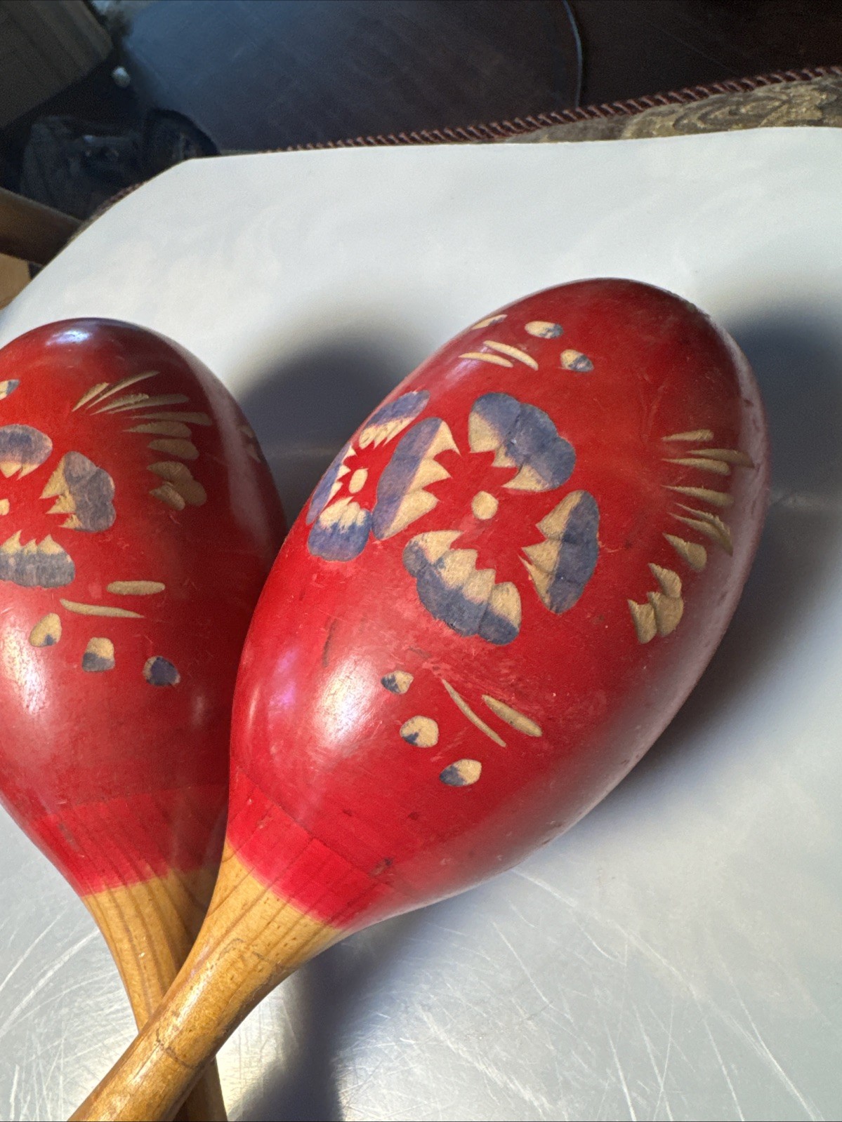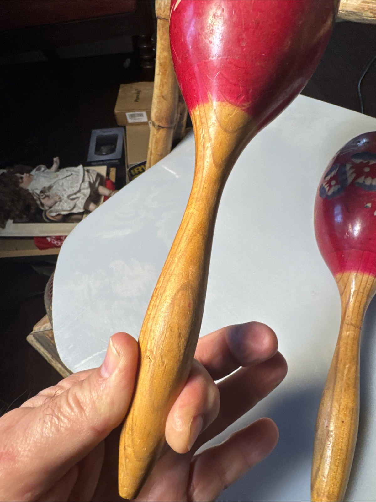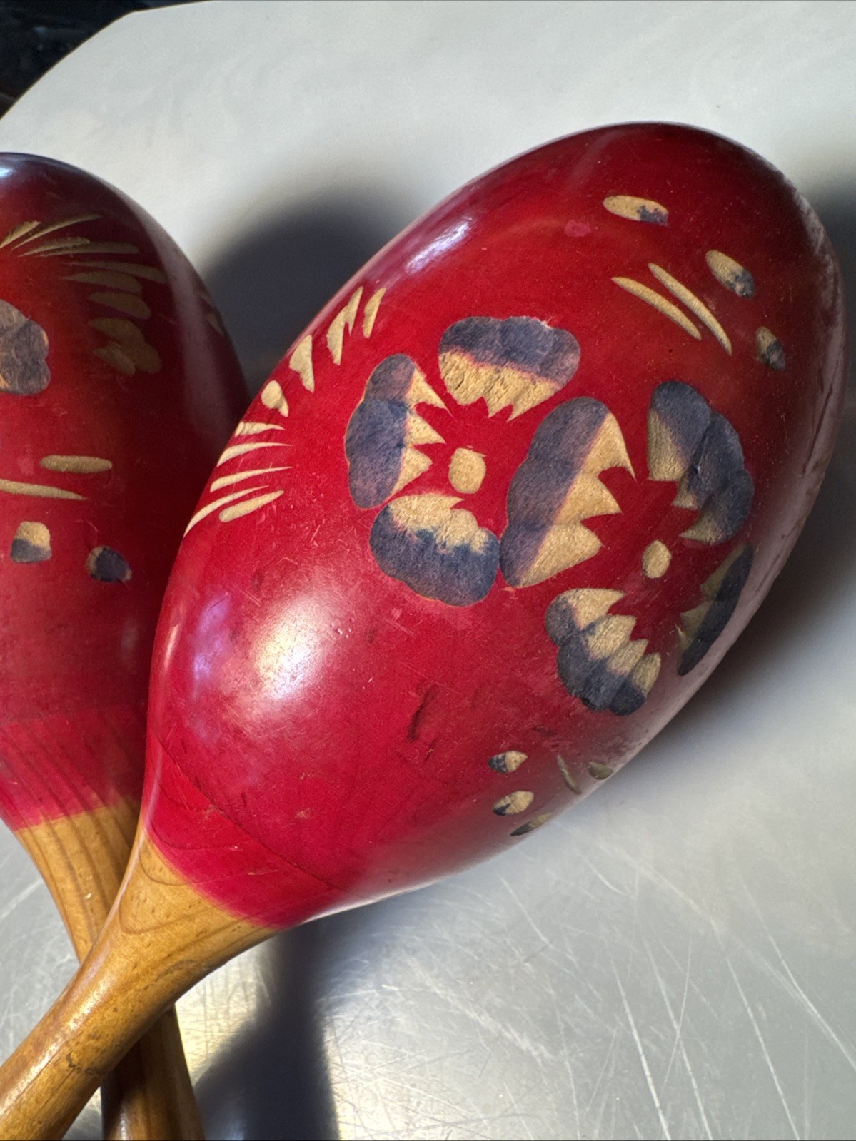 как выглядит Vintage Wooden Painted Fuschia Maracas Hand Carved Flowers Shaker Mexico 11.5 фото