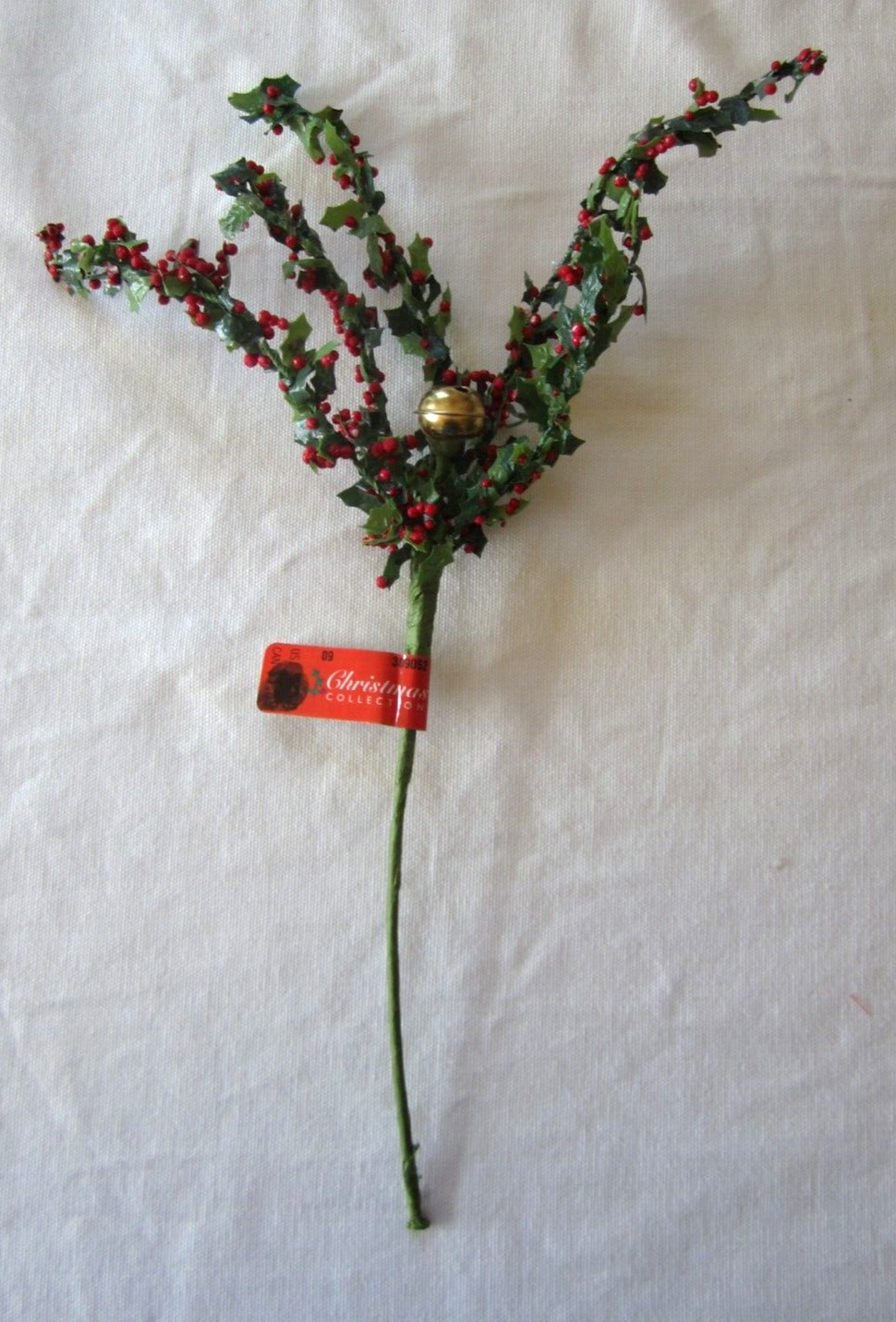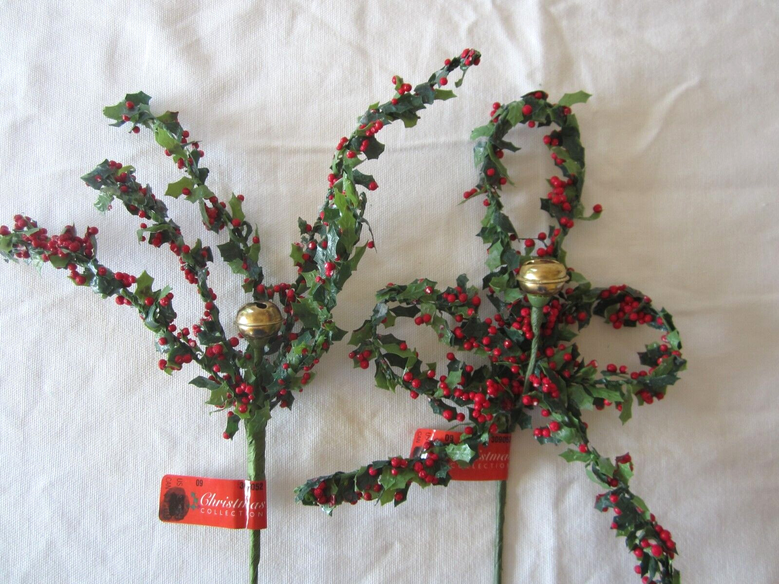 Lot of 2 Artificial HOLLY LEAF BERRY FLORAL PICKS w/gold bells Christmas Holiday